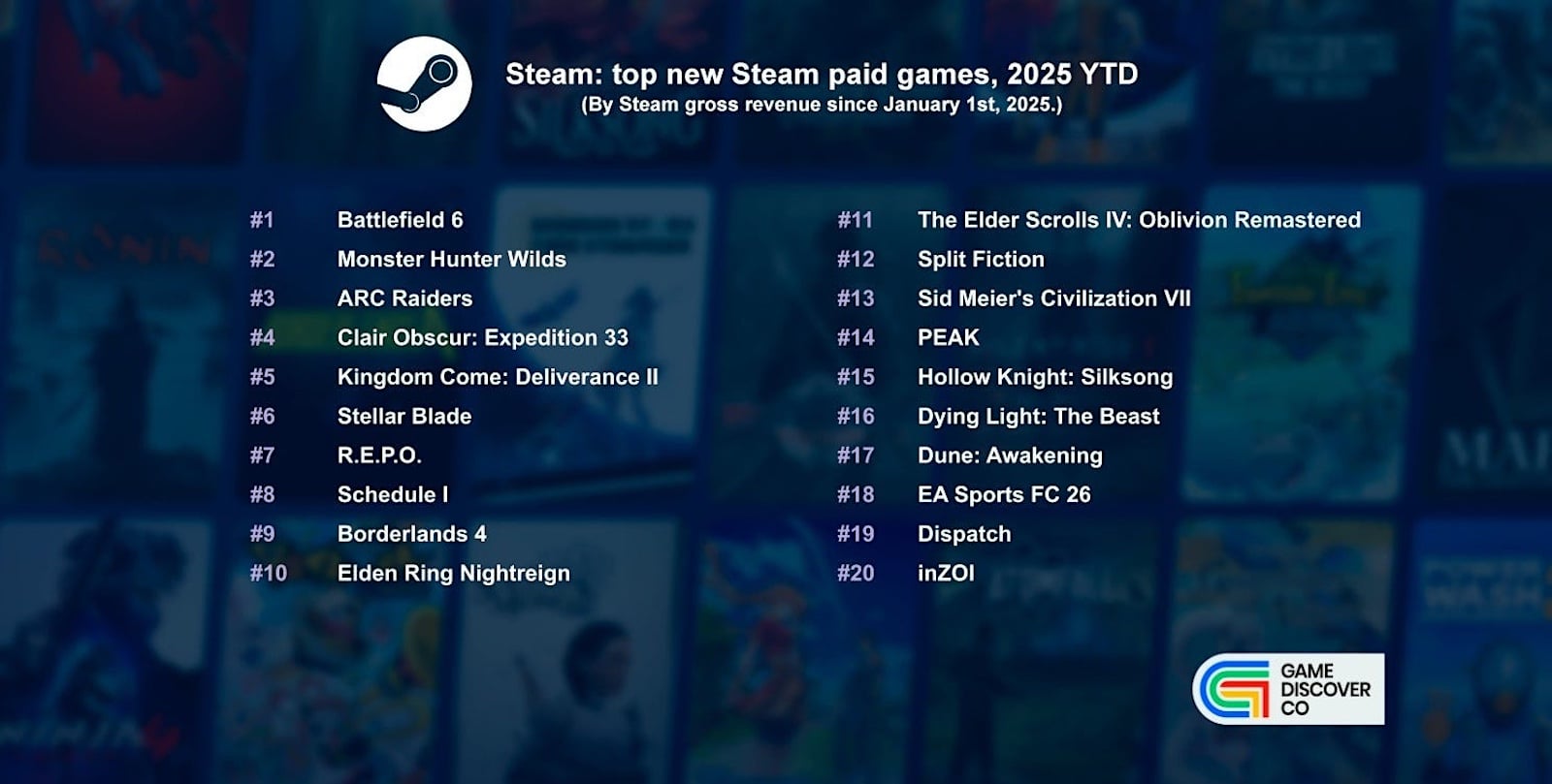 ゲーム市場調査会社のGameDiscoverCoは12月17日、2025年のゲーム業界の振り返りとして、Steamやコンソール向けに今年発売されたタイトルの人気ランキングを公開した。