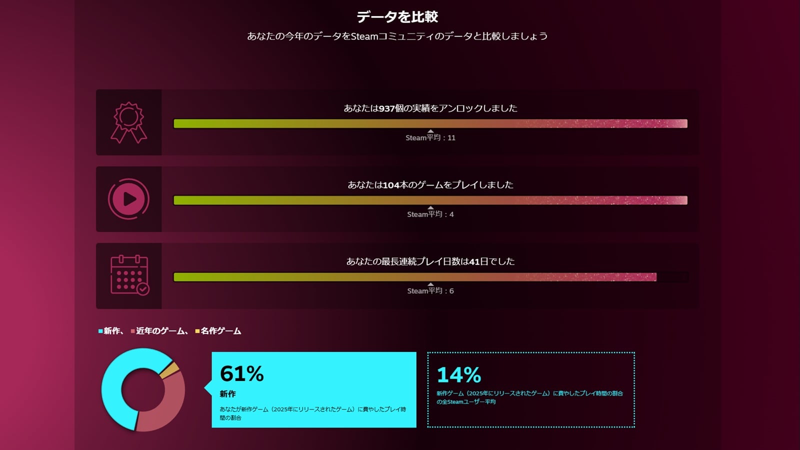 そしてゲームのプレイタイトル数や最長連続プレイ日数といった、一部データを確認する際には、「Steam平均(Steam Median)」として、Steamの“平均的プレイヤー”との値の比較が可能となっている。プレイヤー自身がどれだけSteamに熱中していたかも振り返ることができるだろう。