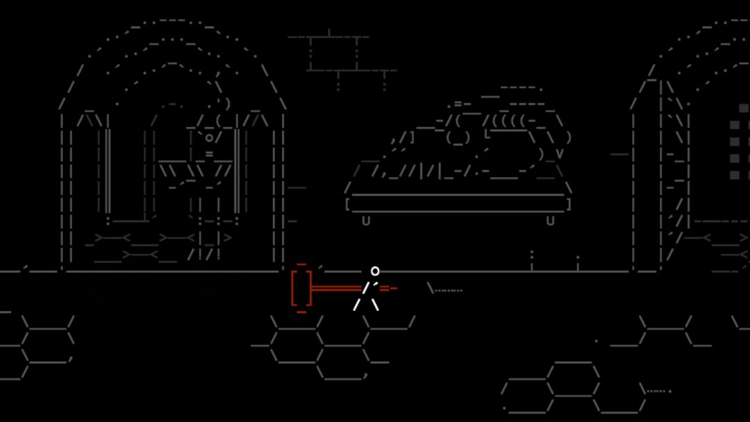 本作のビジュアルは、前作同様「ASCIIアート」によって構成されている。ASCIIアートとは、アルファベットや記号などのテキスト文字を組み合わせ、絵やアニメーションを表現する技術だ。そうした特殊な技法が、本作では全編にわたり採用されている。ゆえに主人公や背景はもちろん、武器やボス、さらにはスキルツリーまでもがテキスト文字で構成されているのだ。