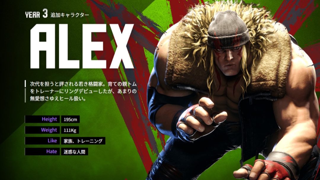 本作では初期キャラクターとして18人が実装され、その後DLCキャラクターとして毎年4人が追加されてきた。今回、Year 3追加キャラクター第3弾としてアレックスが実装。アレックスは初代主人公のリュウに代わるかたちで、1997年に発売された『ストリートファイターIII -NEW GENERATION-』にて主人公として初登場したキャラクターだ。