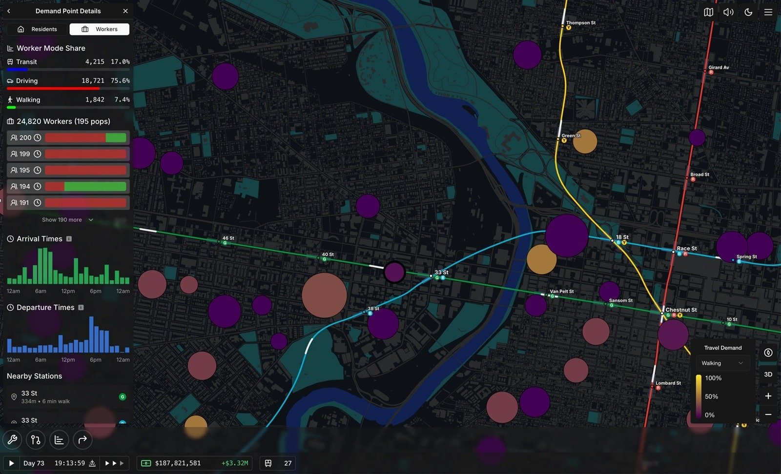 本作の特徴として、作中の都市のデータは実際の国勢調査データに基づいている点が挙げられる。米国の国勢調査では自宅と職場の所在地が記録されているといい、そのデータをベースとして数百万人の通勤者を生成。それぞれに通勤時間と帰宅時間が割り当てられ、通勤にかかる時間や費用も計算されたうえで、実際に“通勤”するのだという。つまり現実さながらの人口分布が再現されているわけだ。職場などが多く昼間に人口が集中する箇所と、住宅街として夜間の人口が多い箇所をいかに効率よく接続していくかを現実的なシミュレーションに基づいて吟味するゲームプレイが持ち味となっている。