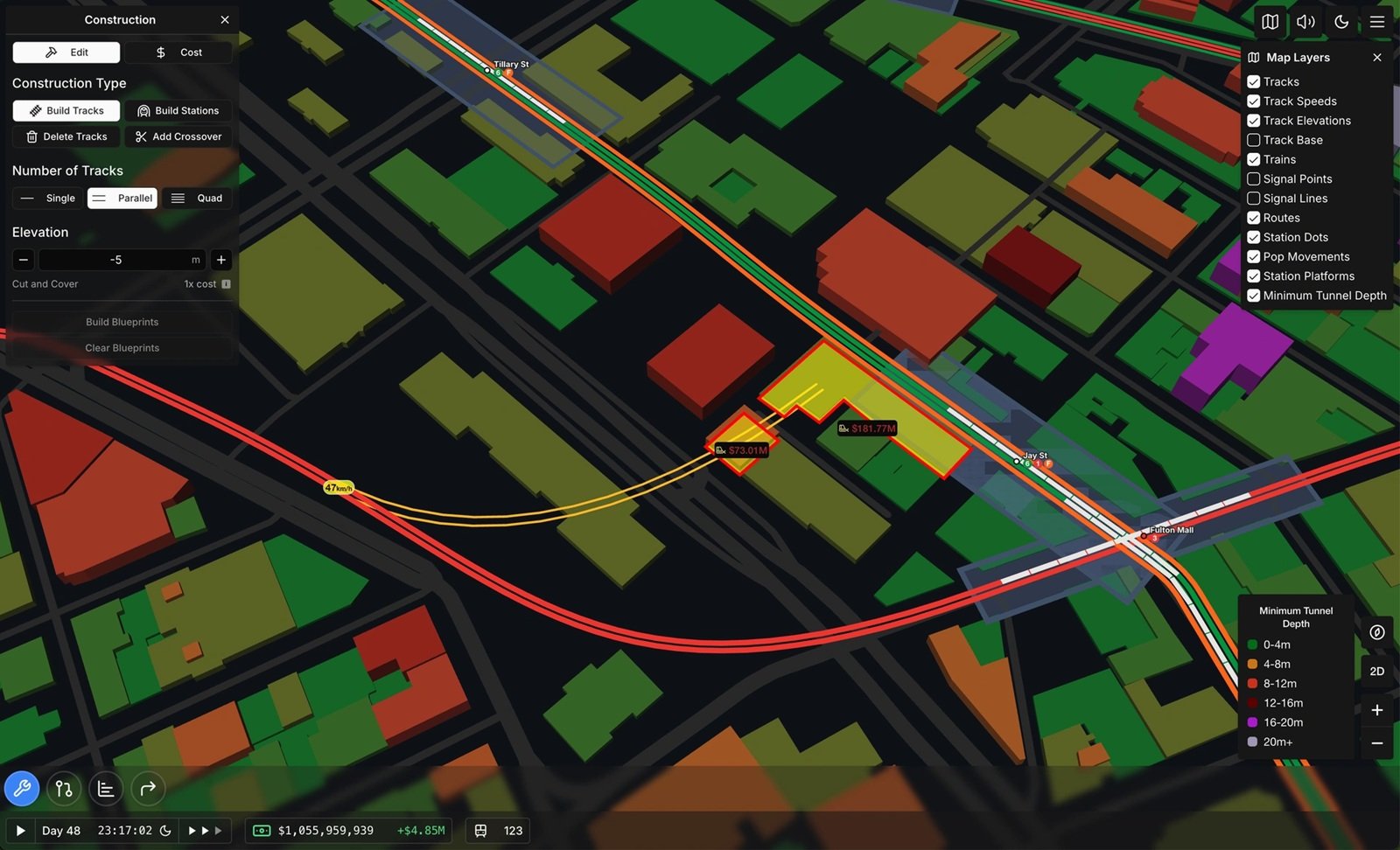 ゲームを開始するとその都市のマップが登場。プレイヤーは好きな箇所に駅を建設し、駅を線路で接続する。駅には最低限の長さが必要であったり、建設する高さによってコストが変動する。地下深くになればなるほどコストが増加し、トンネルの開通、高架橋の建設にも一定の制約を伴う。手持ちの資金だけでなく、線路を敷設する地形などとも相談しつつ路線構築を進めていく必要があるだろう。また線路は単線/複線を選択することもできる。