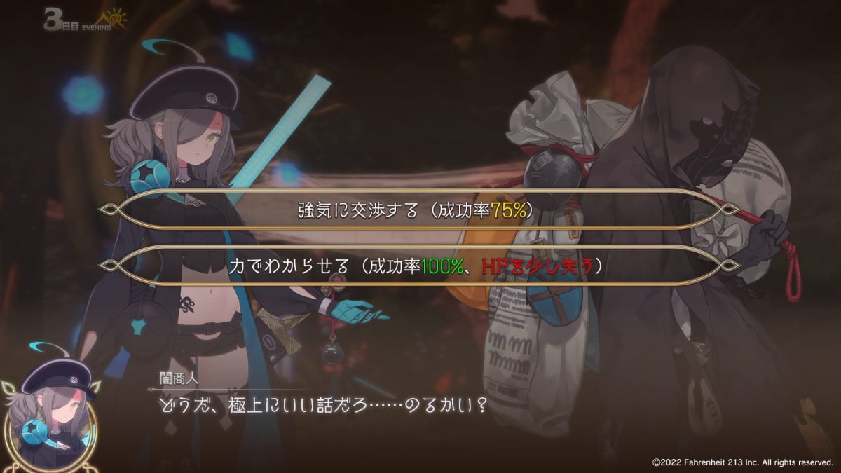 本作では、100日後の決戦まで、プレイヤーは自由に過ごせるという。地道に強化を繰り返してもいいし、いきなり強敵に挑んでも良い。マルチエンドが採用されており、100日を過ごした結果によってエンディングが変化する。