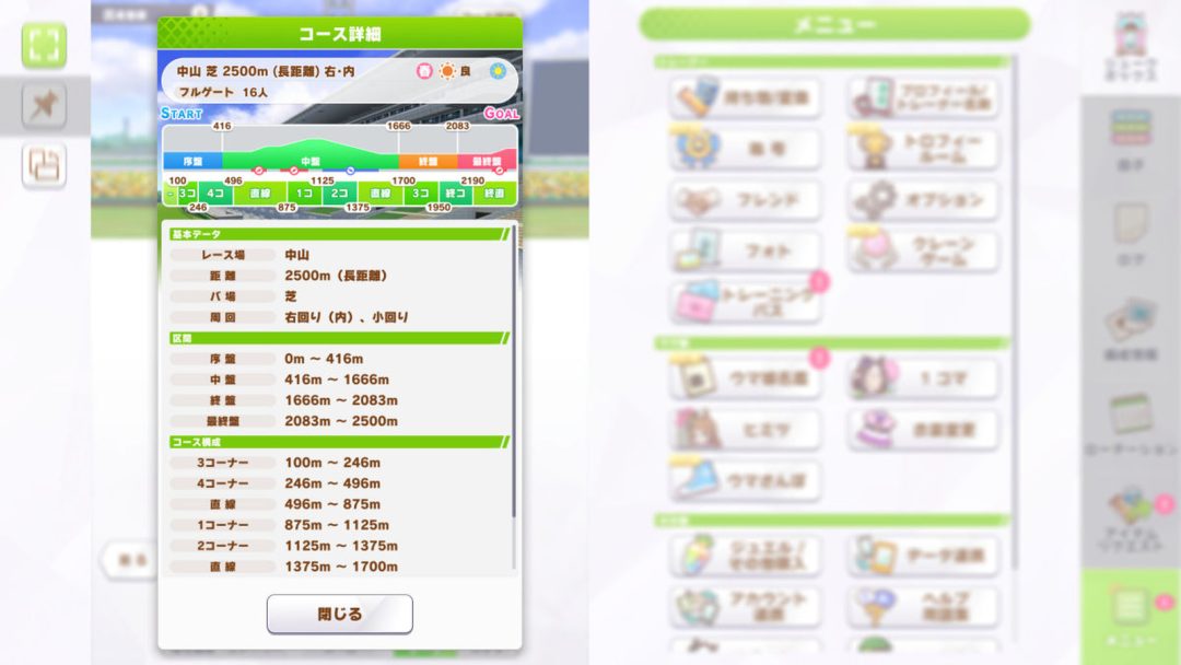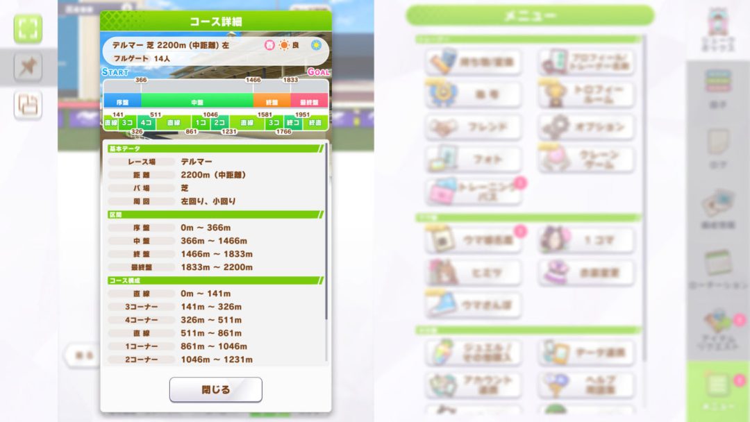 3月11日12時の更新では、そんな本作にて二つの新機能が登場となった。まず「コース詳細」では、本作に登場しているレース場の情報が確認できる。更新後は各レースの出走前などに、「コース詳細」ボタンが登場。コース詳細を押すと、レース場の基本データに加えて、コース図による坂の有無や場所、コースの構成などが、数字と図によってゲーム内で見られるようになっている。たとえば新レースの「BCフィリー&メタアーフ」のコースでは、基本データにレース場がデルマーの距離2200m(中距離)であり、左回りかつ小回りであること。加えて、終盤が1466m地点の直線から始まり、上り坂や下り坂のない平坦なコースである点もゲーム内のデータから読み取れるようになっている。