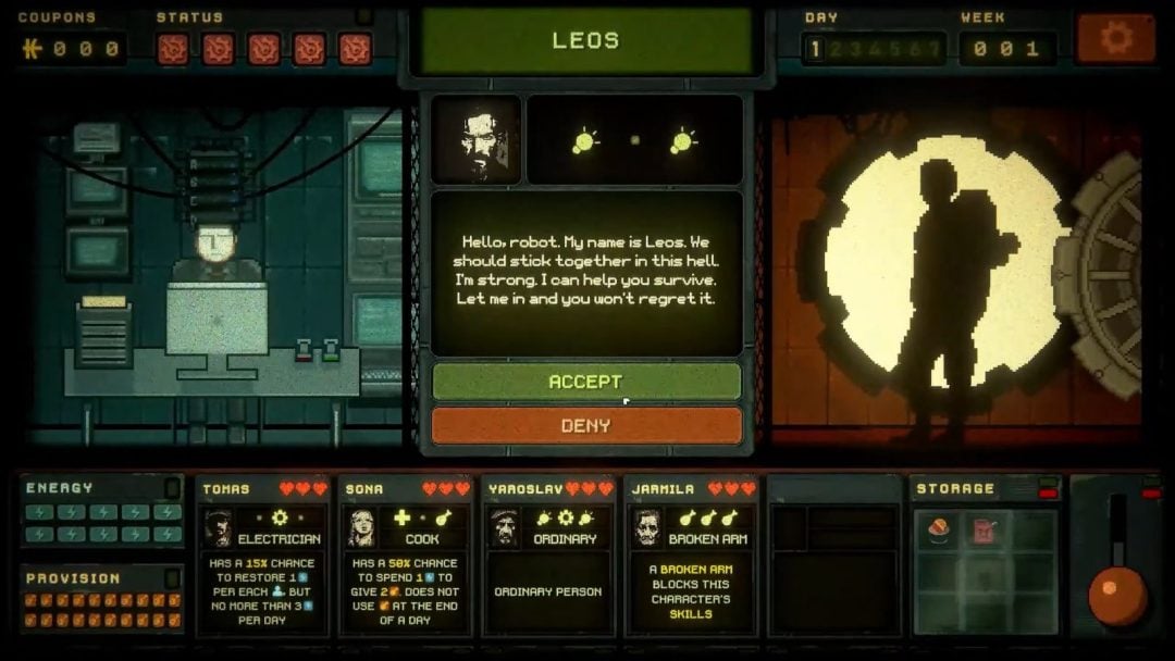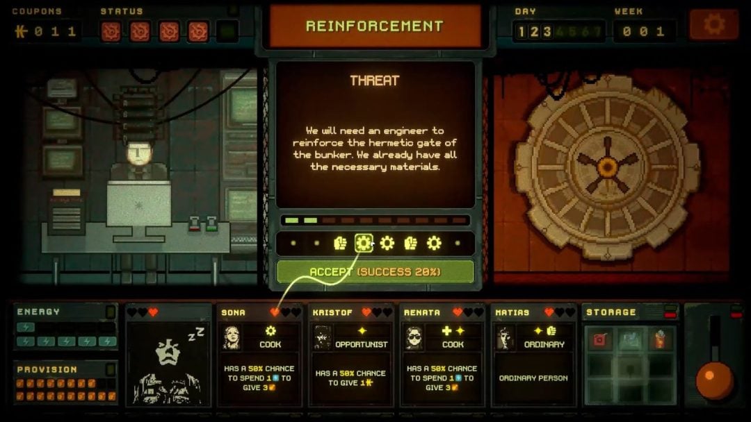 管理人としてまずやるべきことは、外の世界から保護を求めてバンカーを訪れる人々を受け入れるか判断すること。住人にはそれぞれ得意とする作業分野が割り当てられており、得意とする分野が多い住人ほど効率よくバンカー内の作業をこなしてくれる。