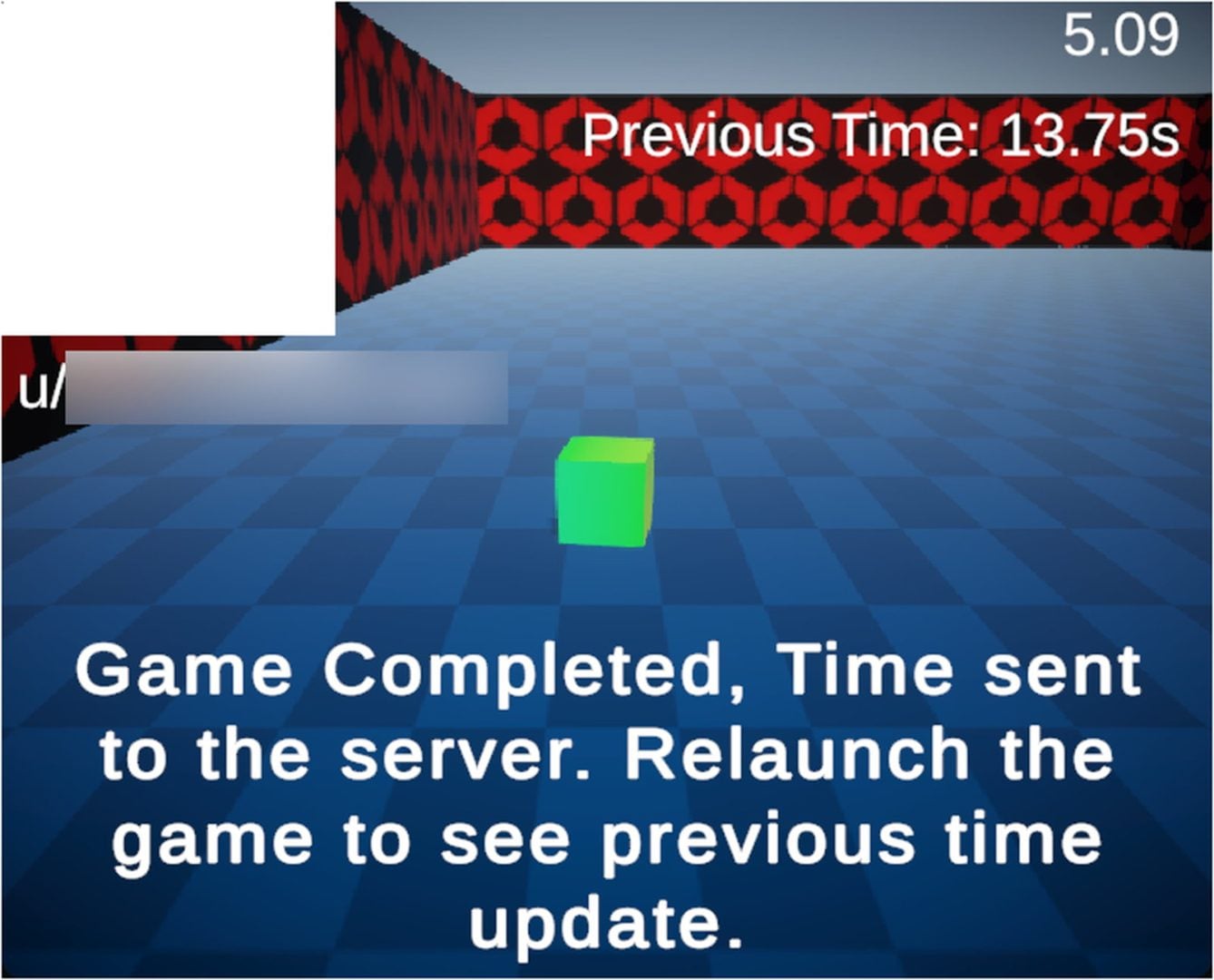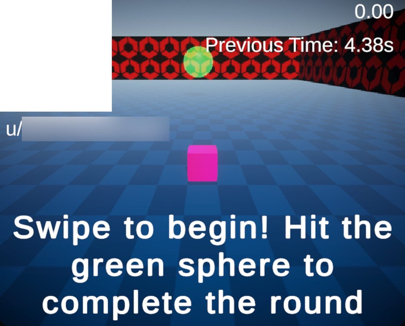 サンプルゲームを起動すると、七色に輝く立方体と、宙に浮かぶ球体が存在する、極めてシンプルな見た目のゲームがスタートする。ゲーム内にはReddit上のユーザー名や前回プレイ時のタイムも表示されており、ゲームとRedditとの間でデータの保存ややり取りができているのを確認できる。ちなみにゲームはスワイプ操作(PCの場合はマウスのドラッグ)で立方体をジャンプさせ、できるだけ早く球体に触れるという内容である。スマートフォンでもPCでもプレイ可能だ。