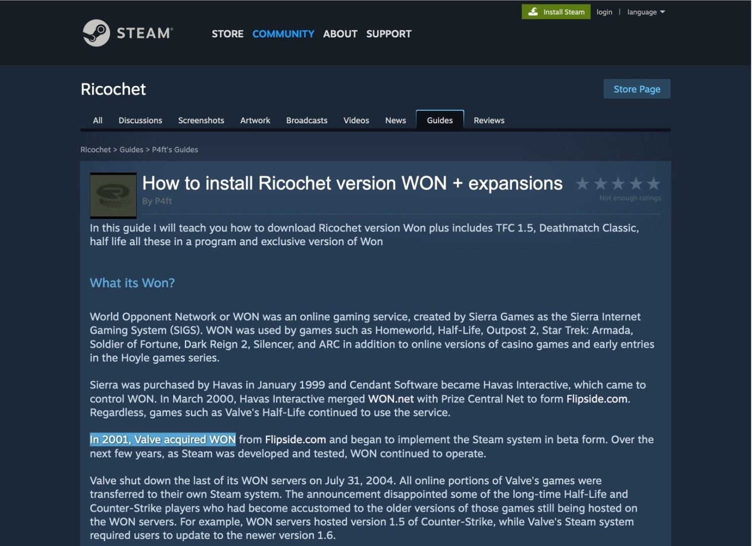 この原告側の異議申し立ての内容について、Redditにて注目が集まっている。というのも、ValveによるWON買収の証拠として原告側弁護団が提示したのは、とあるSteamユーザーがValveのアクションゲーム『Ricochet』のコミュニティページに投稿したインストールガイド(現在は削除済み)と、Sierra関連の情報がまとめられたWikiページだったためだ。そこには、2001年にValveがWONを買収したと記載されている。
