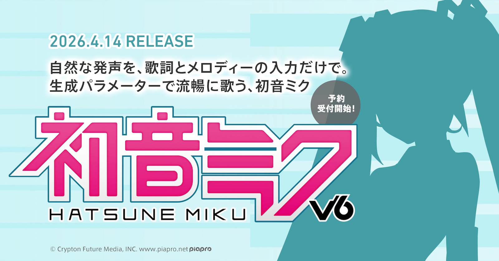 VOCALOID6対応「初音ミク V6」4月14日発売へ。VOCALOIDとしては約10年ぶりの初音ミク、AI機能搭載で自然な調声を実現