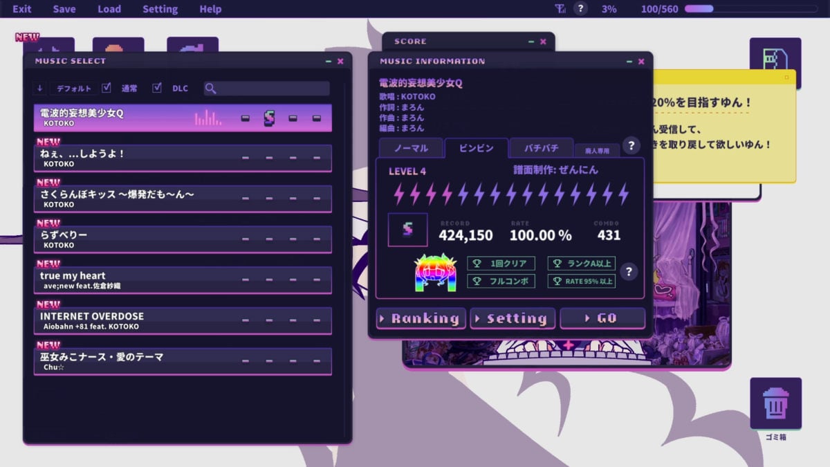 Qちゃんは電波ソングを聞いてゆんゆんになることで、世界を狂わせていく。本作でプレイヤーは、電波ソングを用いたリズムゲームをプレイする。降ってくるノーツにあわせてキーボードを操作し、高いスコアを目指すのだ。また本作にはドキドキ度/ゆんゆん度/カリスマ度といったパラメータが存在する。リズムゲームのプレイによって、怪文書をポストしてゆんゆん度を高めたり、ドキドキ度の上昇によって部屋探索が可能となったりなど、Qちゃんを取り巻く世界の様子も描かれていく。本作ではリズムゲームのプレイによって、物語も展開されていくのだろう。