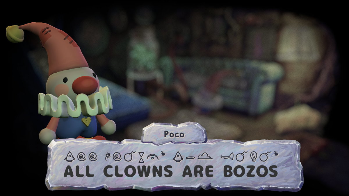 さて、問題のPocoの台詞ですが、あっさり解読できました。結論から言えばPocoの台詞も英語で書かれており、多くの場面では文法的にしっかりした文章になっておらず、単語を列挙するかたちになっています。ひとつの図柄につき英語のアルファベット1文字に対応しているシンプルなものでした。台詞の例を出すと「BELL POCO ROCKET CIRCUS FLY HOME」とか「BEETLES TOGETHER FRIENDS」といった具合ですね。スクショはゲーム中でほぼ唯一ちゃんと文章で喋っているシーンです。翻訳すると「ピエロは全員バカだよ」。なんてこと言うんだPoco。