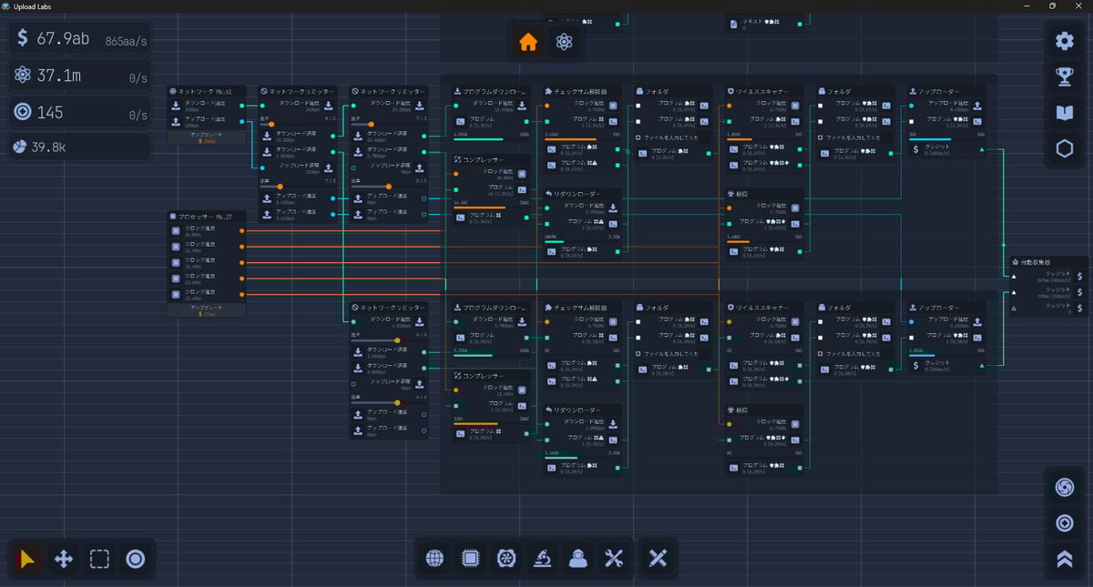 『Upload Labs』をプレイしていました。最初はもっと放置系かと思っていたんですが全然そんなことはありませんでした。というのも、新たなノードを設置したり、新しいアップグレードをしたりするたびに、ボトルネックが変わっていくんですね。あっ、ここの通信速度が足りていないから手を入れなきゃ。おっと、こっちの処理が詰まっているからもう少しリソースを割いてやらないと。そんな感じで最適化をしているうちにお金が貯まり、また新たなボトルネックが発生するわけです。その作業がとっても楽しい。