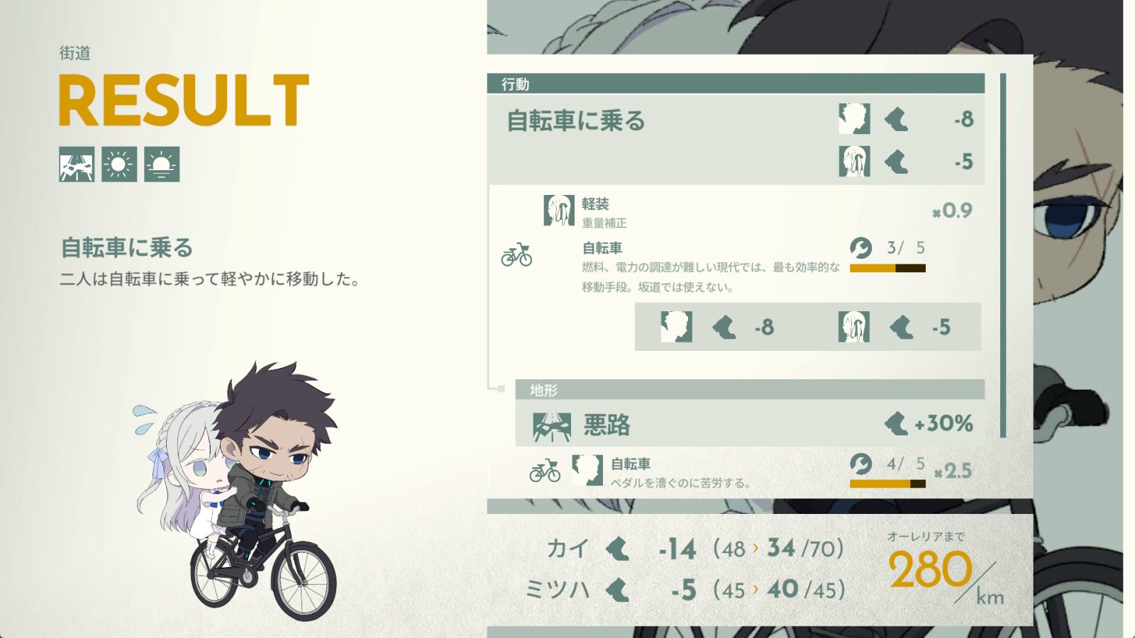2人の旅は、ローグライク風のシステムによって展開されます。本作で2人は、スタミナを消費して移動していきます。スタミナが尽きて、回復用の食料もなくなるとゲームオーバー。スタミナ消費を軽減する装備品や消耗品を活用するなど、上手くリソースを節約しながら旅を進めていくのです。多少のランダム性はあるのですが、起こる出来事はほとんど決まっており、リソース管理のローグライクとしては難易度もカジュアルめ。ストーリーもサクサク進むので、内容に期待しすぎると肩透かしを食らってしまうかもしれません。ただし、不思議な少女に出会うポストアポカリプスものの空気感はばっちり。ローグライトな旅を通して、おそらく開発者のやりたかったであろう雰囲気がしっかり伝わってくる作品でした。