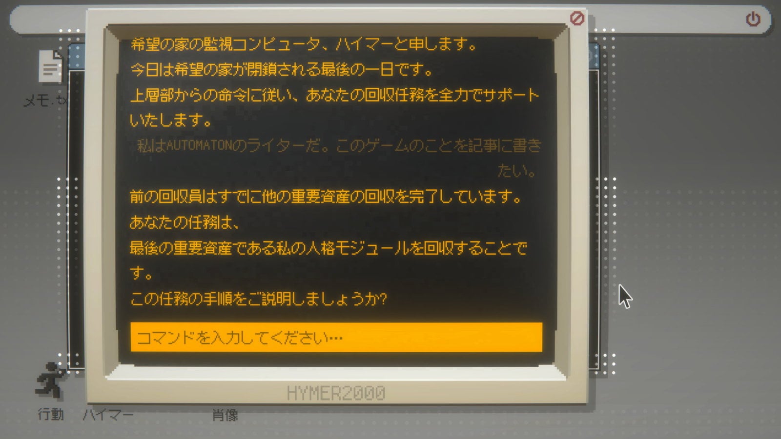 ではハイマーはどうかと言うと、こちらも自然な会話はできるようで、できませんでした。会話が自然になることもありますが、プレイヤーの任務進行状況に合わせて、特定のキーワードに反応して決められた応対をするといった印象。しかしすばらしいのは、そうした状態である理由が、廃墟のAIであるゆえに機能制限された状態で稼働していると、物語の中でサラッと説明されていることでしょう。本来であれば自然なやり取りをできていたはずのハイマーが、かろうじて起動してぎこちなく動き続けている。AIとの成り立たない会話そのものを、物寂しさを漂わせる演出として使ってしまう。この一点だけでも拍手したいくらいですが、全体のストーリーも描写も最高の作品でした。