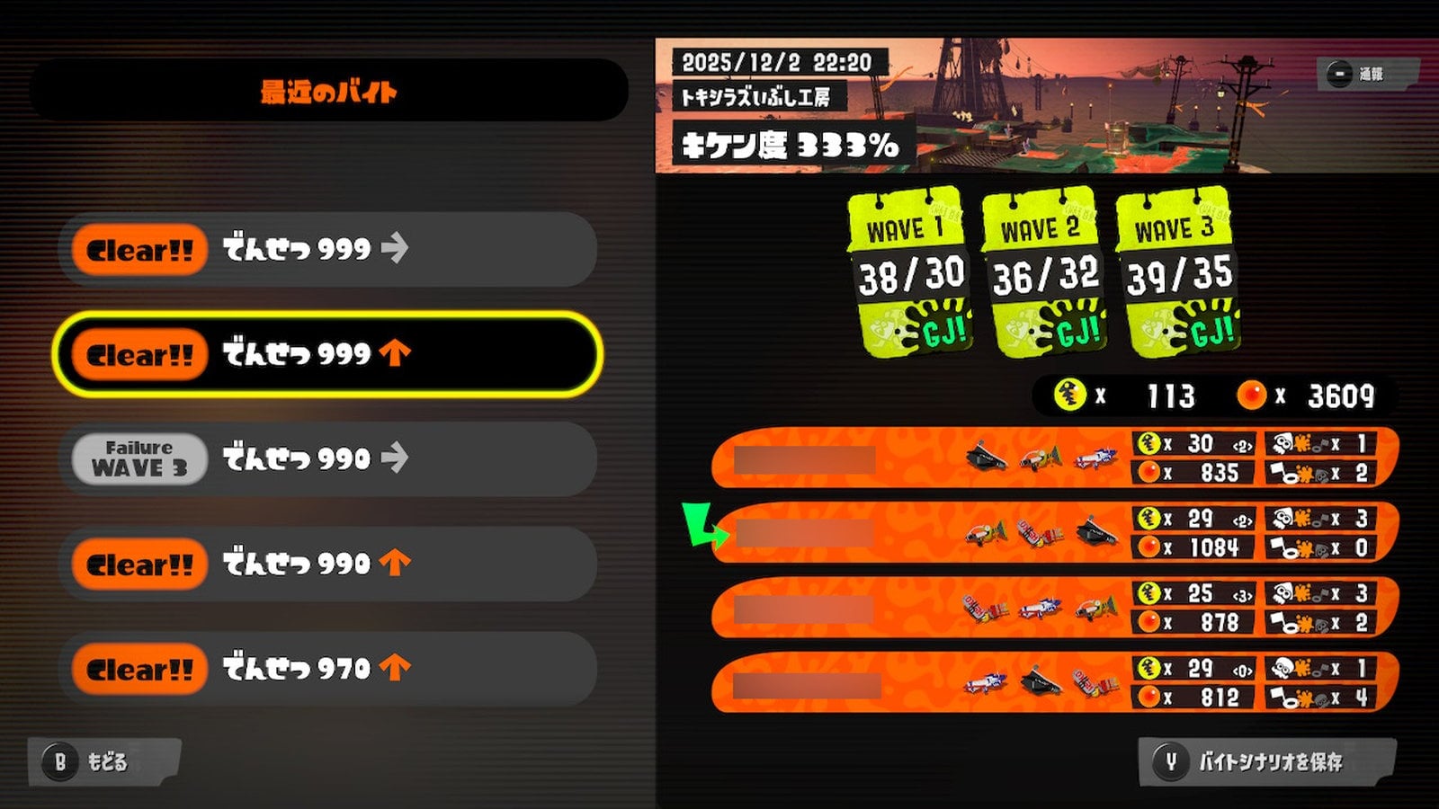 再開してからは難破船ドンブラコとトキシラズいぶし工房の2ステージでカンスト。何度か失敗はしてしまいましたが、特に沼ることはなく、比較的短い時間でカンストまで持っていくことができました。むしろ自由に立ち回れるどんぴこ闘技場や、さほど難しくないすじこジャンクション跡のほうが失敗率が高く感じます。難しいとされるステージのほうが歴戦のバイトたちとマッチングしやすいんでしょうか。まぁ真のバイトはどんな状況でも仕事をこなすもの。極めて重要な塗りへの貢献度すら表示しないクマサン商会のバイトヒストリーなど気にせず、楽しんで金イクラ集めに励みたいですね。