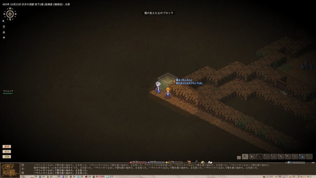 『Elin』をプレイしていました。新しく追加された種族「吸血鬼」関連の要素をいろいろ見るために作ったデータを進めています。新要素の確認ばかりをしていたため、ゲームとしては全然進んでいなかったんですよね。普段はのんびりとプレイして自然と育つのに任せるのが好きなんですが、吸血鬼のデータでは効率を意識した育成をお試し中です。現在は初期拠点すぐ近くにある仔犬の洞窟の壁を掘り、土の床に加工して金策としつつ、疲れたらお弁当(後ろの少女ちゃん)を口にして再び採掘といったサイクルをひたすら回しています。通常の食事が摂れない代わりに吸血でどんどん潜在能力を高められるので、プレイ時間のわりにかなり成長してきました。