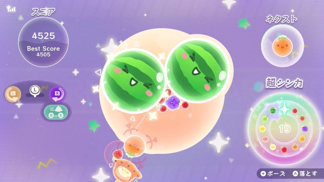 フィールドが枠で囲われていた前作とは違い、360度自由な方向からフルーツを投入できるため、フルーツが埋まって無駄になる状況が比較的少なく、スイカを作るのもやさしめな印象です。とはいえ、ダブルスイカまで狙うとなると結構パンパン。スペースがあっても、大きなフルーツほど押されると動きやすいこともあって、不意にフィールドから溢れてしまうこともしばしば。ここまで来るとパズル性をより意識するようになり、それが楽しくてついついプレイしてしまいます。