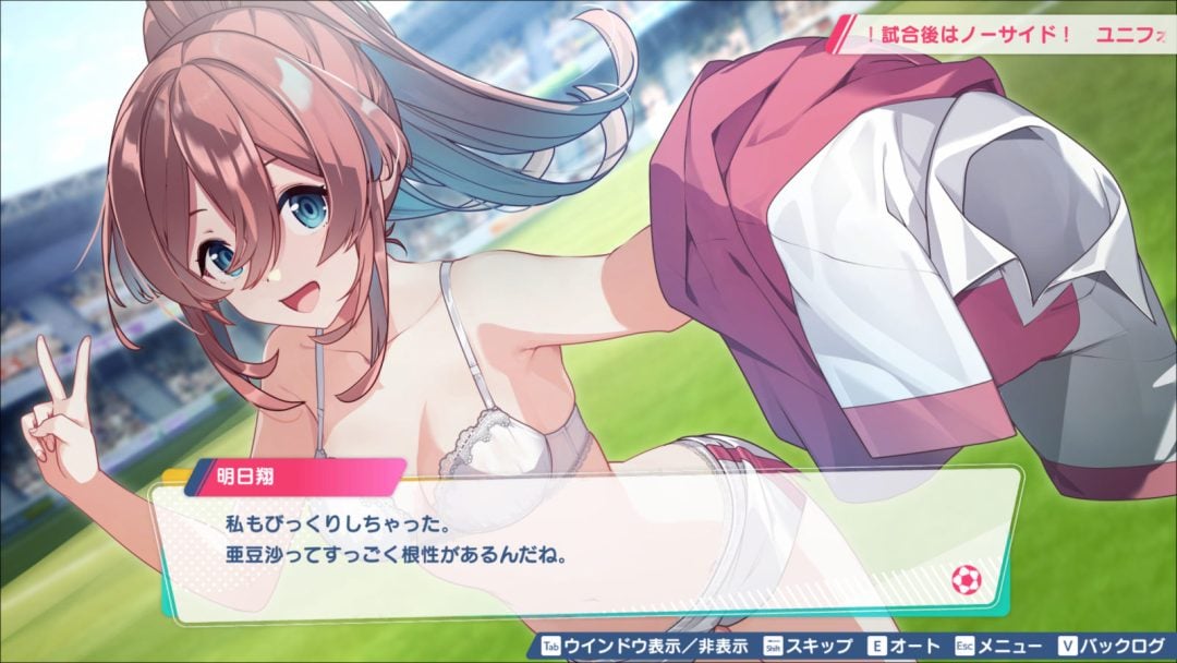 本作で選手たちは、試合後にユニフォーム交換と称して服を脱ぎ始めます。事前に情報として知ってはいたんですが、当然とばかりに突然脱ぎ始めるので困惑。「私もびっくりしちゃった」とか言ってますが、びっくりしてるのはこっちなんですよね。そんな具合に突然脱ぎ始める様子を笑いながら進めていたら、段々サッカー部分が面白くなり始めて、気がついたらクリアしていました。ゲームとしては最終盤まで対戦相手が弱く、大味ではあります。一方でボールを持ってから数秒間の無敵や、ボール保持側とディフェンス側でそれぞれ用意されたコマンド、フォーメーションによる違いや対策、相手選手ごとに傾向の異なる読み合い要素などが搭載。カジュアルながら意外と遊べる、突然脱ぐだけじゃない作品になっていました。バランス調整したバージョンが遊びたいぐらいです。