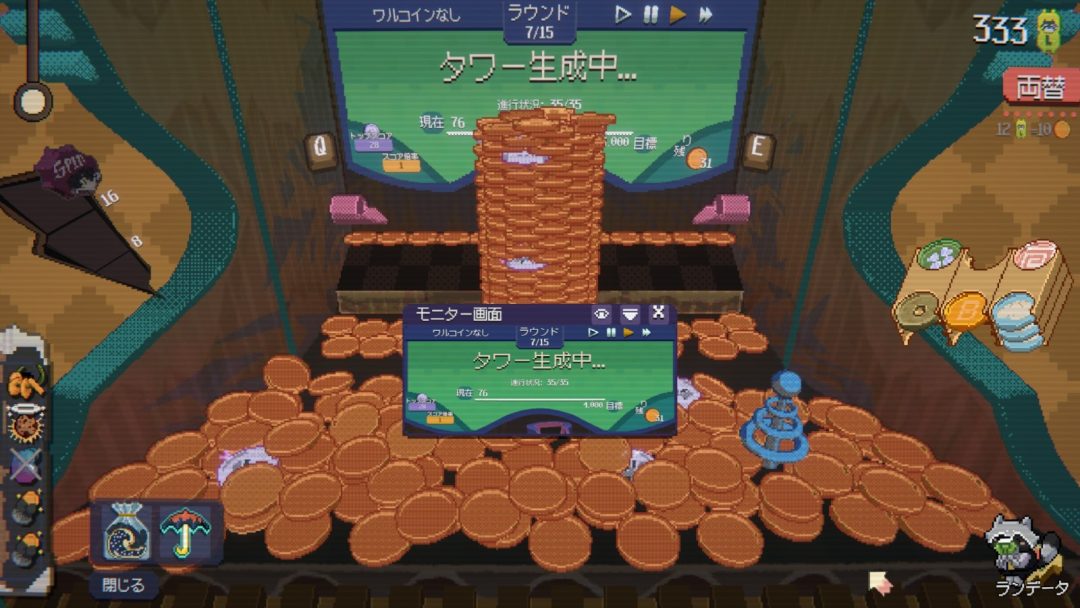 昨今では「脳汁」「ドーパミン」といった言葉がゲームプレイの快感を表す言葉としてよく用いられますが、大量のコインが盤面に登場し、数字が大きく増えていくのを眺めるのは気持ちがいい。アイテムもUFOや爆発などド派手な演出が多いのも“快”を体現している。考えなしにコインを投げているとスコア未達気味になることもしばしば。とはいえ豪華な「ジャラジャラ感」が、準備や耐えのフェーズを感じさせない“ドーパミンマシン”としてかなり優秀な気がしています。気持ちよさも感じつつ、こういうゲームはあまり熱中し過ぎるとあっという間に時間が消えてしまう危ない予感もしており、あくまで片手間程度に嗜んでいます。