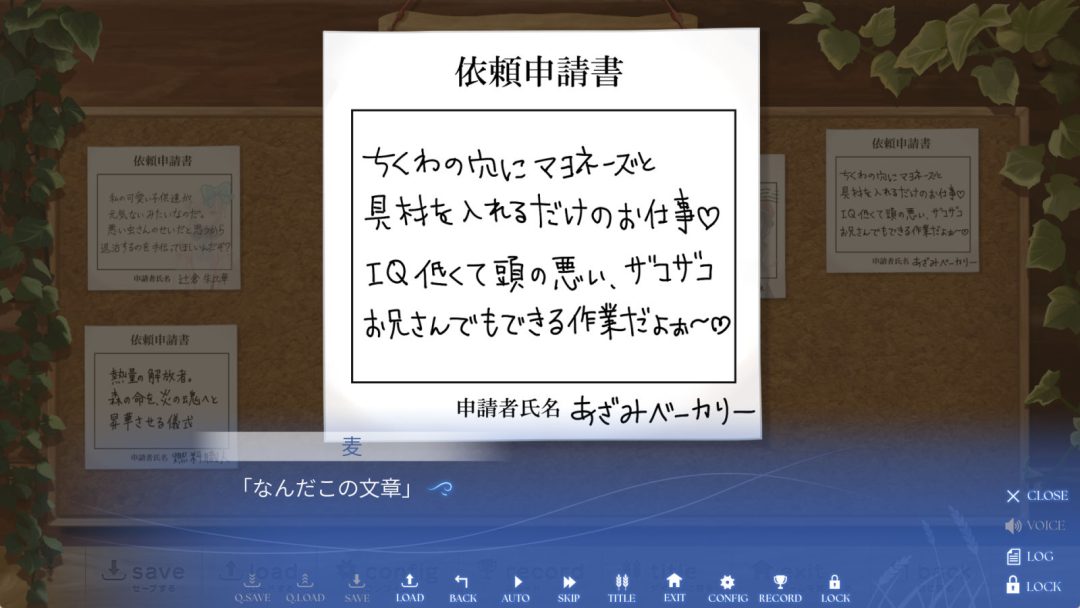 まだまだクリアは遠いのでほぼ共通ルートの感想になるのですが、今のところは賑やかなスローライフといった雰囲気が気に入っています。本作では、主人公の受ける依頼を共通ルートの途中からプレイヤーが選択します。ヒロインたちと関連した依頼以外に、思わず「何それ」と口走ってしまうような北海道のローカルネタを面白おかしく調理したシナリオなんかも多数存在。依頼文自体が気になるモノも多く、深く考えずに依頼を選んでいたら、いきなりサブキャラクターのルートに入っていました。個別ルートに入るとまた雰囲気が変わってきますが、今のところは天丼多めな田舎社会での明るいスローライフを楽しんでいます。
