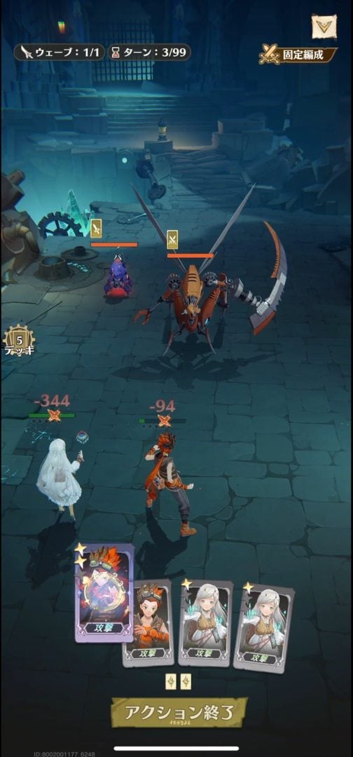 ひとまず手持ちのカードを融合させ、ラジの範囲攻撃を軸に攻撃を仕掛けてみる。するとザコ敵の機械は一掃できたものの、カマキリ型の機械にはダメージが入っていない。そしてカマキリ型の機械の反撃を受け、ラジは一発で瀕死の状態に。どうも今のラジたちの力では対抗できない強さのようだ。ムービーが挿入され、ストーリーの流れとして逃走することに。