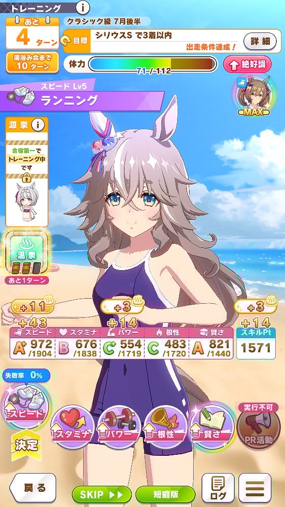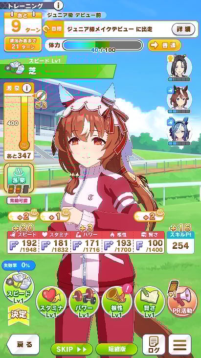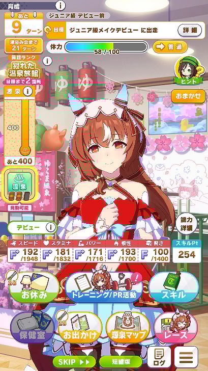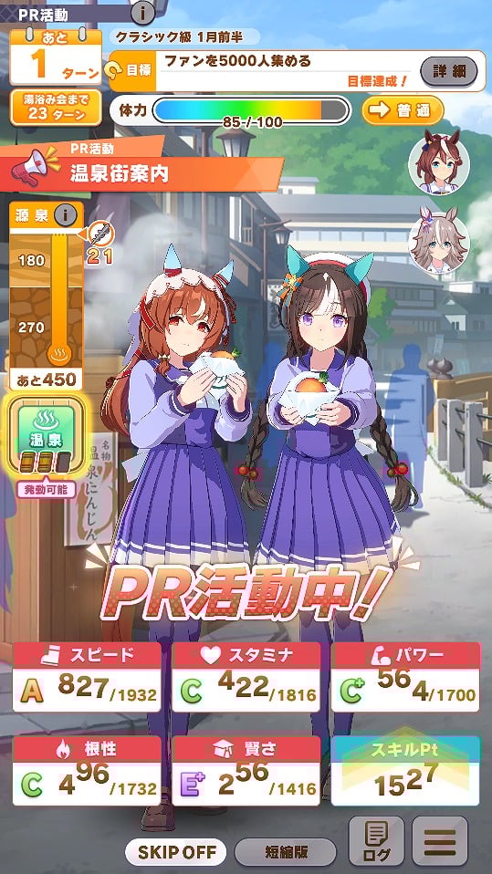 ただ、温泉の効果は2ターン続くため連続で温泉に入ることは出来ない。タイミングを見計らって温泉に入り、超回復を起こして激しくトレーニングすることになる。ただし、この回復効果のお陰で「友人とお出かけ」や賢さトレーニングを踏むことが若干減りがちなので、そこは注意する必要がありそうだ。また、温泉の効果は「無人島編」とは異なりすべてのパラメータが大幅に上昇するというわけではなく、編成しているサポートカードに依存する。そのため、たとえばスタミナのサポカを抜くとスタミナのパラメータは若干落ちるという印象がある。超回復で得られるスキルPt分を考えるとこのあたりは差し引きでトータルプラスになるようにも思う。