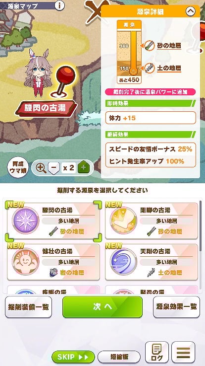 源泉はクラシック、シニア級と進むごとに増えていくのだが、少なくとも体験会ではすべての源泉を掘り切る事はできなかった。そのため、新しい源泉が出てきたら現在の掘削を中止して新しい源泉を掘るほうがよいのか、という駆け引きも必要になってくると思われる。このあたりは前回の育成に比べるとやや難易度は高くなるのでは?と思わされるが、「Legends編」のローグライクほどに要素の複雑さは感じなかった。慣れてくれば「無人島編」の建物を立てる順番のように回せるのではないだろうか。掘った源泉にはさまざまな効果があるのだが、いよいよ温泉に入ってその効果を体感することとなる。