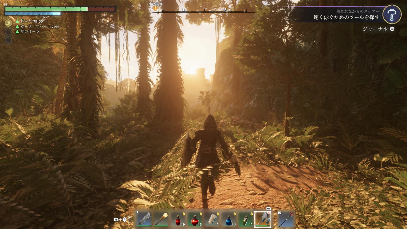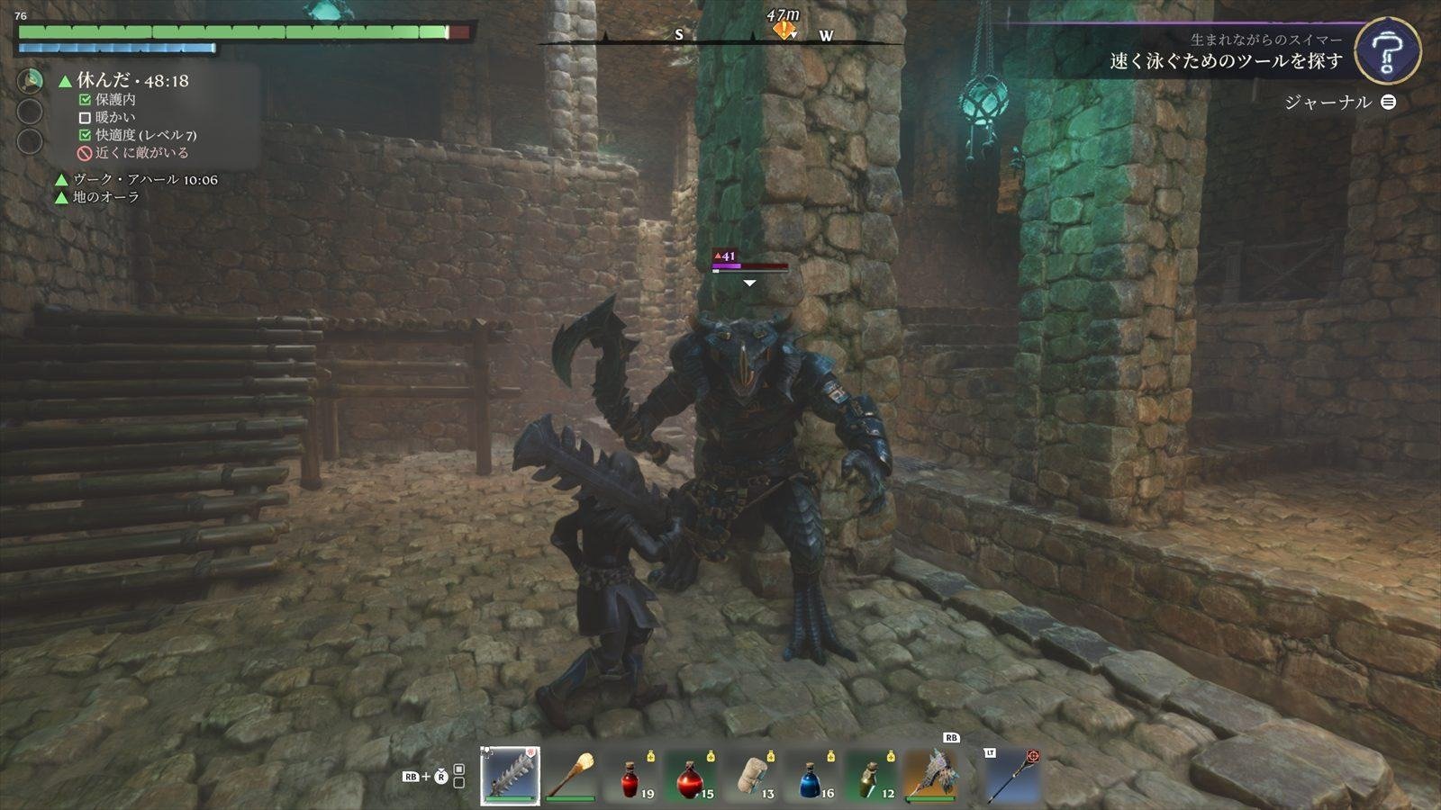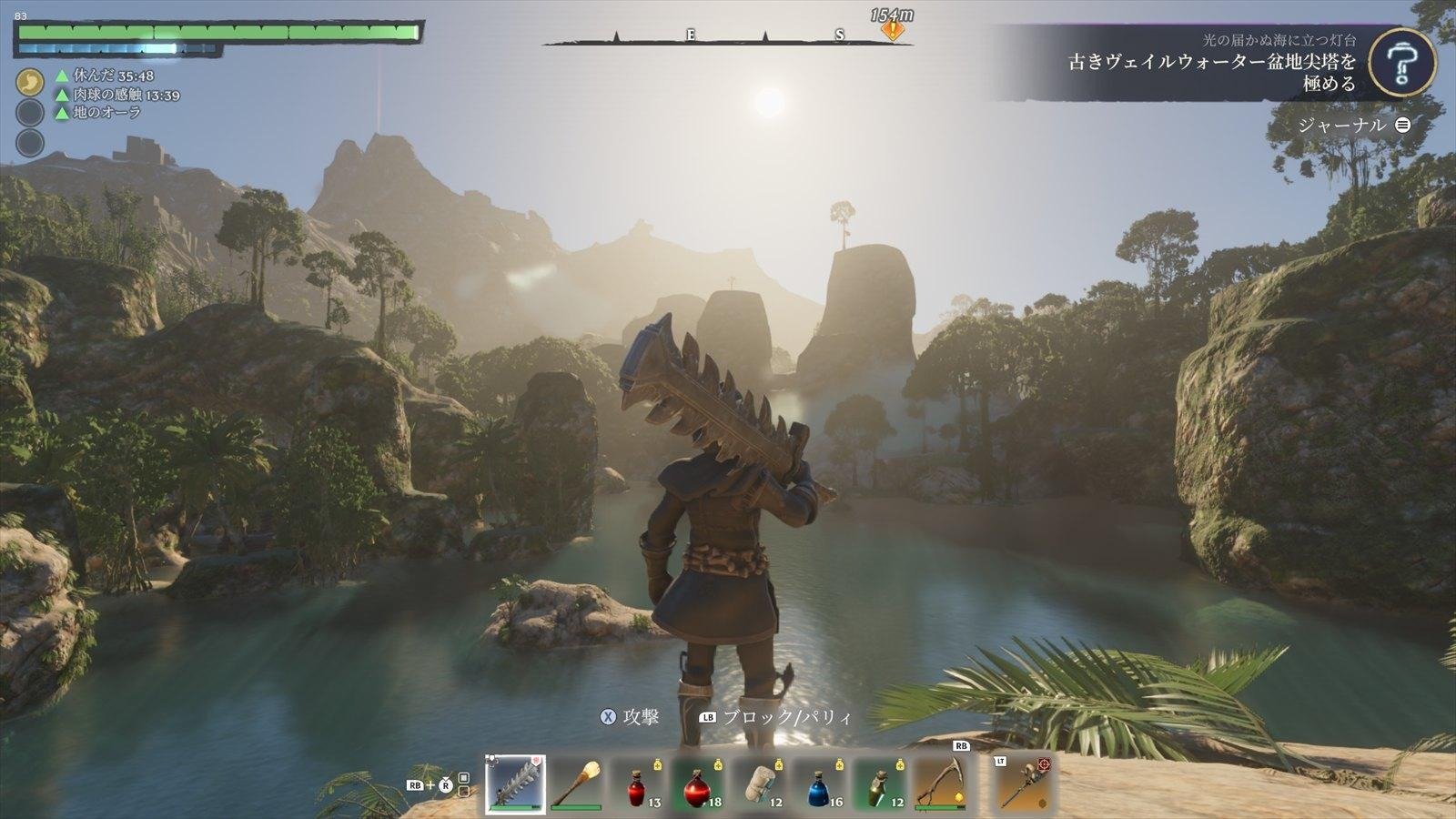 全体の戦闘バランスも調整されており、武器の耐久値が上がって継戦能力が増した一方で、休息による回復速度は減少した。これにより、後退と回復を繰り返す“ゾンビ戦法”は通用しにくくなり、ポーションや包帯といったリソース管理がより重要になっている。敵の攻撃パターンを見極め、間合いを測り、リスクを取りながら攻めるという戦闘の基本がよりスリリングになり、戦闘の緊張感は確実に増加。水際の戦闘では誤って水に落ちてしまい、一方的に攻撃されてしまうなどの問題もあるが、新エリアにふさわしい水のギミックも用意され、戦闘はより厳しく、より楽しい感覚だ。