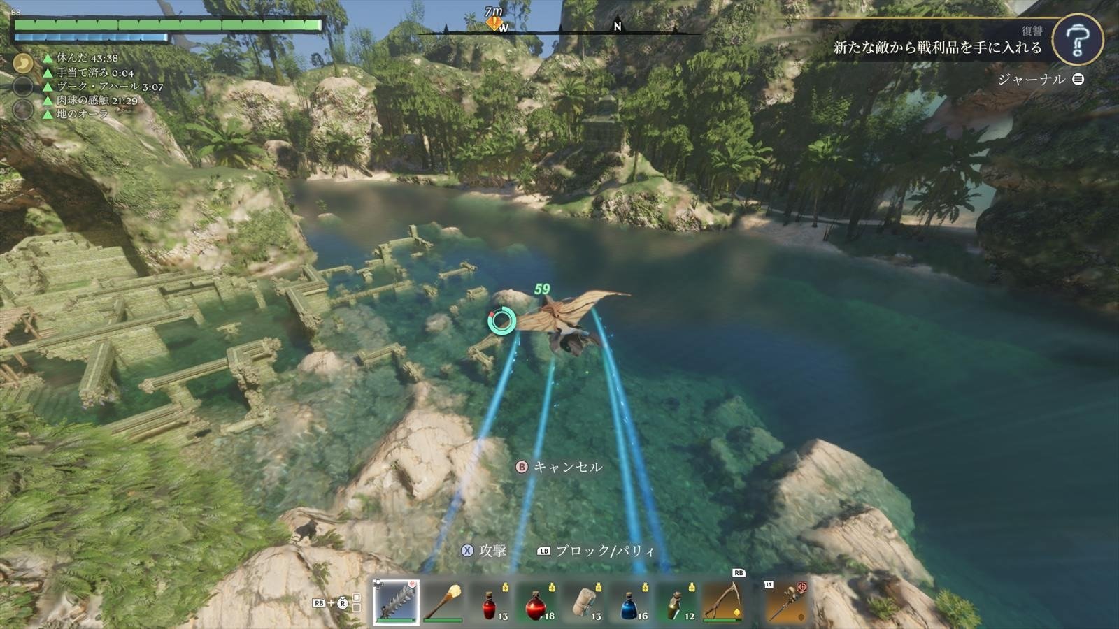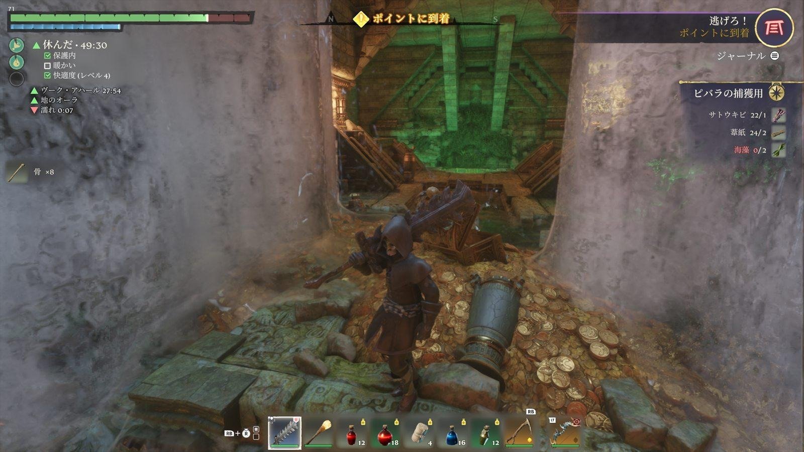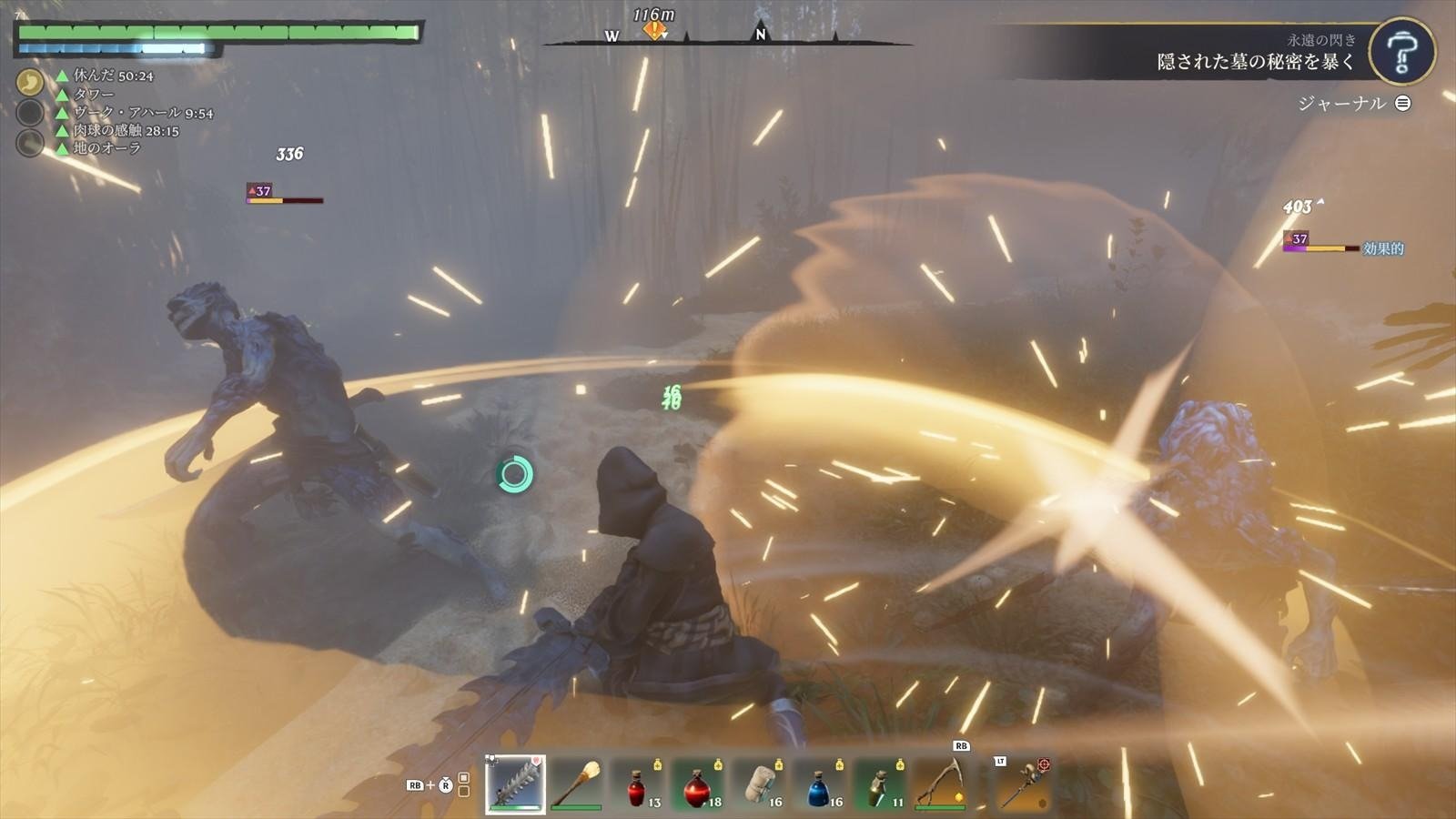 全体の戦闘バランスも調整されており、武器の耐久値が上がって継戦能力が増した一方で、休息による回復速度は減少した。これにより、後退と回復を繰り返す“ゾンビ戦法”は通用しにくくなり、ポーションや包帯といったリソース管理がより重要になっている。敵の攻撃パターンを見極め、間合いを測り、リスクを取りながら攻めるという戦闘の基本がよりスリリングになり、戦闘の緊張感は確実に増加。水際の戦闘では誤って水に落ちてしまい、一方的に攻撃されてしまうなどの問題もあるが、新エリアにふさわしい水のギミックも用意され、戦闘はより厳しく、より楽しい感覚だ。