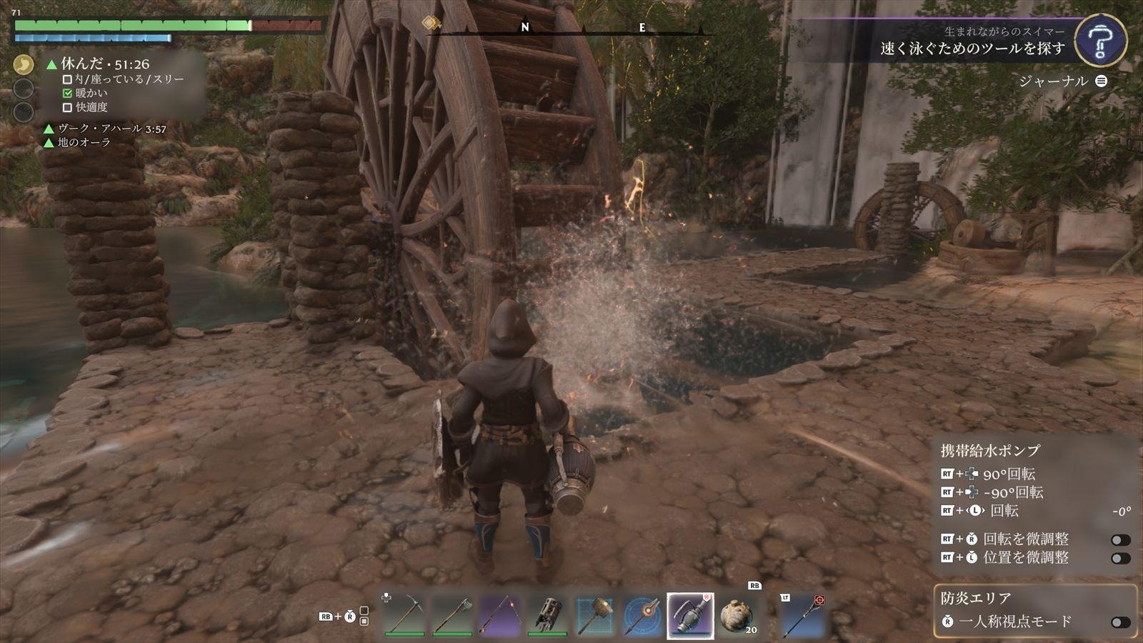 泳ぎや潜水、ダイビングも可能になっており、水を利用したギミックも用意されている。とはいえ、単純に水辺を掘って小川を作り、ポンプで水をまき散らしてみる、といった“水遊び”そのものが楽しい。そんな本能的な好奇心が刺激される。