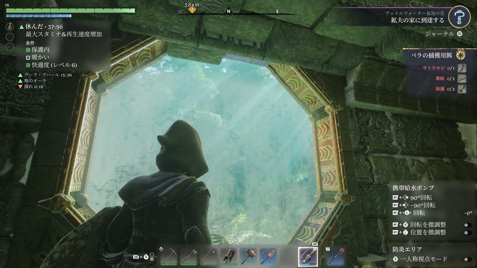「ヴェイルウォーター盆地」は見た目こそ明るく穏やかだが、難度は決して低くない。水中の探索、即死級の罠、謎解きが適度な緊張感を生む。そして大量の新装備や報酬の見直しで、探索のモチベーションが補強されている。