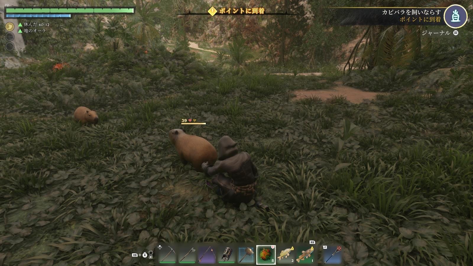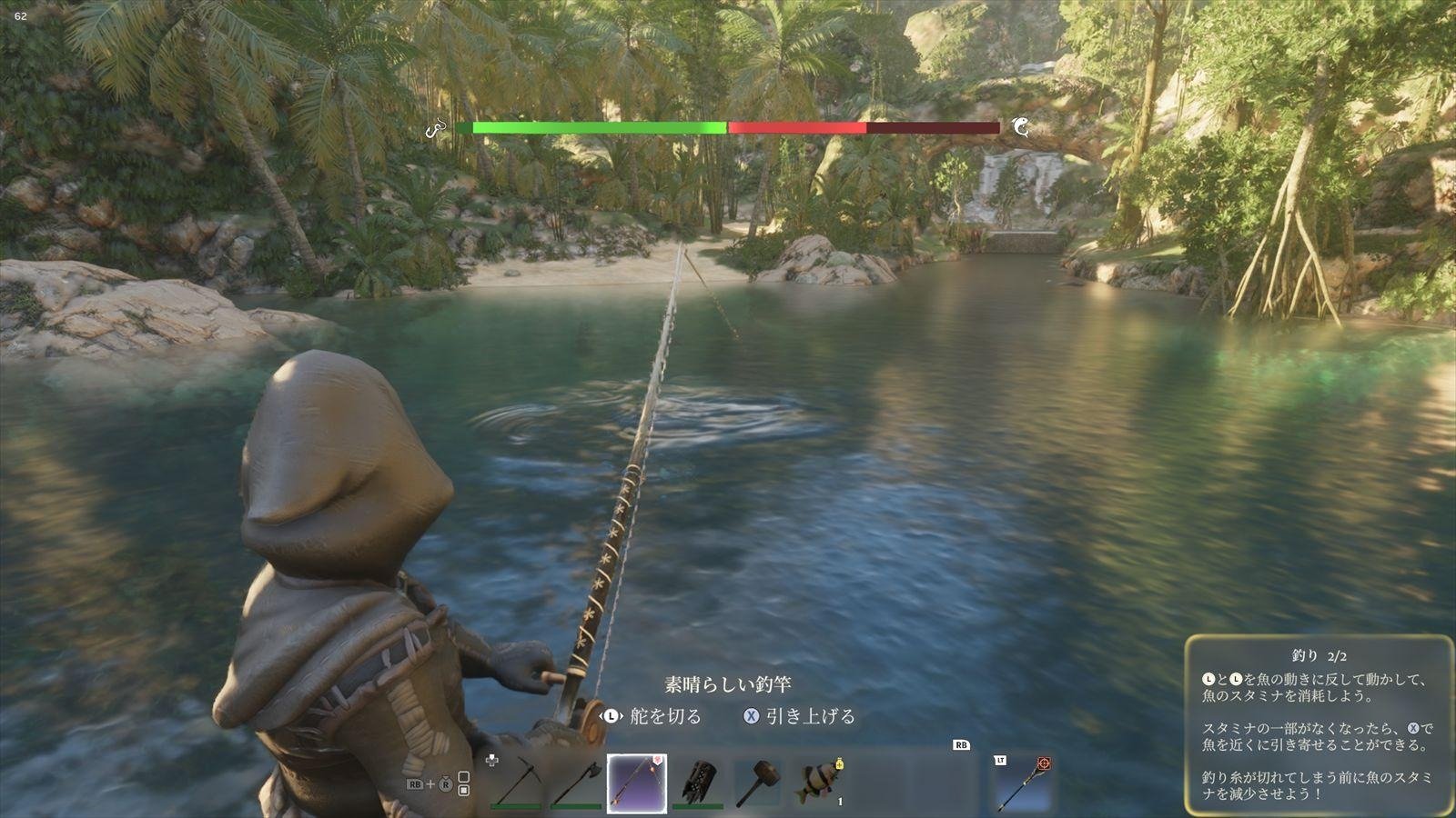 戦闘や探索の変化に加え、生活要素も充実した。釣りやカピバラの飼育、「じょうろ」による農作物の生育状況確認など、プレイヤーの日常生活を豊かにする仕組みが加えられている。特に釣りは水辺であればどこでも行えるシンプルなミニゲームで、魚の動きに合わせて竿を引くだけの直感的な操作だ。釣った魚は料理の素材として利用でき、調理によって酸素量の上昇など実用的な効果が得られる。シンプルな仕組みで熱い駆け引きなどはないものの、穏やかさを重視した設計で、探索の合間に一服の癒しを提供してくれる。