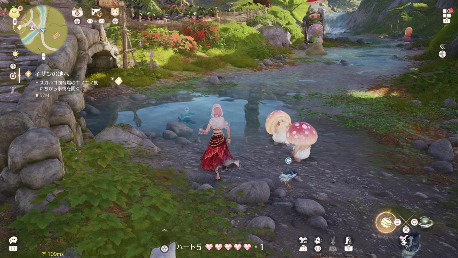 ドレス姿で街中をふわりと飛び回るこれまでの『インフィニティニキ』もシュールに見える瞬間はあったが、今回のアップデートにより、ドレス→巨大化→ドレスがくるくる入れ替わるという、もはやなんのゲームなのかよくわからない画が眼前に広がる。しかしなかなかどうして、スケールが大きいイザンの地では意外にも巨大なニキの姿はなじむ。通常時は見上げるほど大きかったキノコが、巨大化すると同じような背丈になりまったく印象が変わるなど、探索には“一粒で二度おいしい”ような楽しさが加わっている。