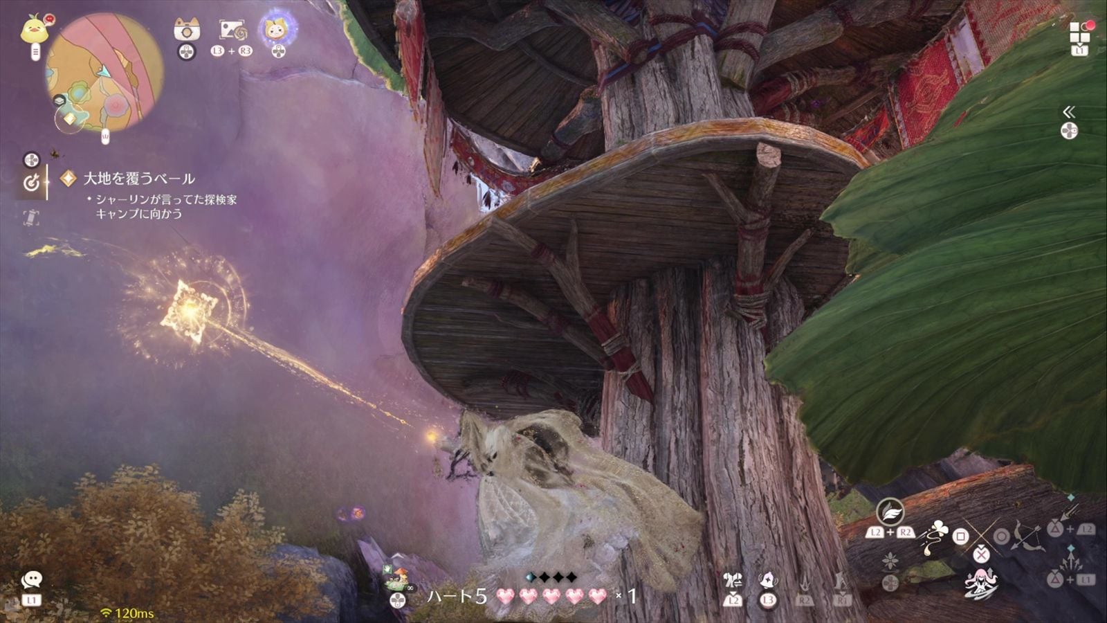 今回のアップデートを象徴するのが、ニキが一時的に5メートルほどの巨体へと変身する新スキル「巨大化」だ。ニキはイザンの地に入って間もなく、巨大化用のスキルコーデを入手できる。巨大化中、ニキは森の植物を跨ぎ、岩場を一歩で超える。ダッシュ主体だったこれまでの移動と比べはるかに速く移動することができ、“世界を大股で歩く”感覚は心地よい。発動中は専用のゲージが減っていくため無制限ではないが、切り替えのテンポが良くゲージも自動回復するため、ほぼストレスなく多用することが可能だ。