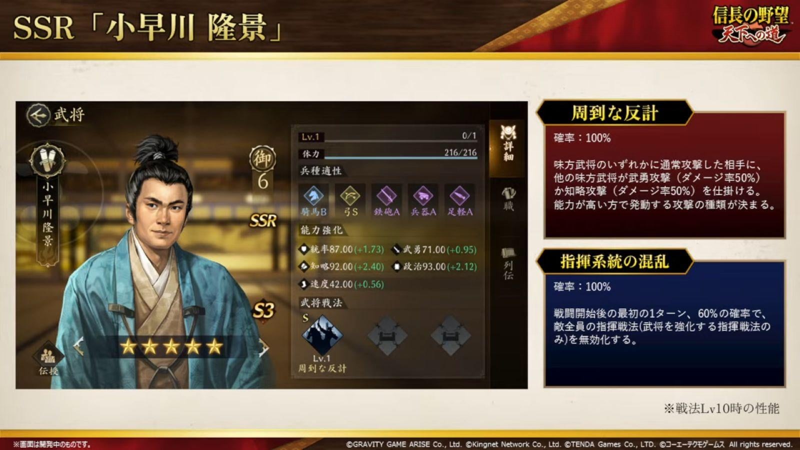 以下、シーズン3から追加された新要素を紹介する。まずは新シーズン恒例の新規SSR武将たちについてだ。「小早川隆景」は高い知略を持ち、相手の指揮戦法の多くの効果を60%の確率で無効化する伝授戦法「指揮系統の混乱」を持つ。指揮戦法を重視した部隊を強烈に対策できる可能性を秘めたユニークな武将と言えるだろう。