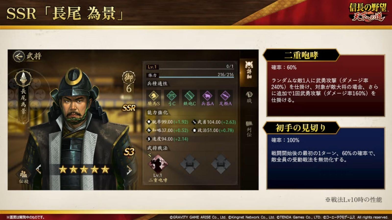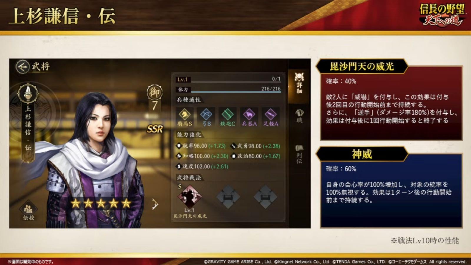 さらに、ハーフアニバーサリーを記念して、新規SSR武将「上杉謙信・伝」が追加される。本作のライセンス元である『信長の野望·天道』に登場した上杉謙信の伝承を再現した武将で、統率、武勇、知略に優れる上、自身の会心率を100%上昇させつつ対象の統率を100%無視する伝授戦法「神威」が非常に強力だ。「上杉謙信・伝」は、ハーフアニバーサリーで新たに加わるコンテンツ「楽市楽座」で初めて登場する。