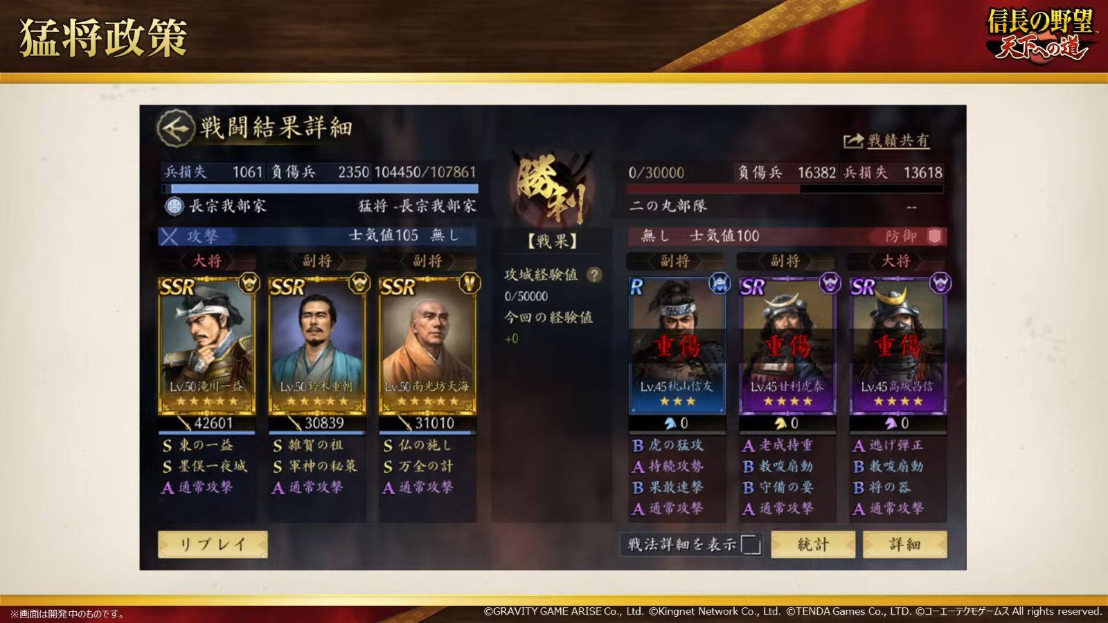 各勢力の方針を決める指針となる政策にも、新たな要素がいくつか加わる。目玉となるのは、敵拠点に対して強力なNPC部隊を出撃させる「猛将出撃」だ。現れる猛将はSSR武将のなかからランダムで選ばれ、敵拠点に攻撃を仕掛ける。召喚されるのはあくまで一部隊のみだが、注目すべきは最大で18万にも達する部隊総兵力。プレイヤーが通常指揮する部隊とは比べ物にならない大軍団となるため、拮抗した戦場であれば勝ち負けをひっくり返してしまう展開も十分にありえる。