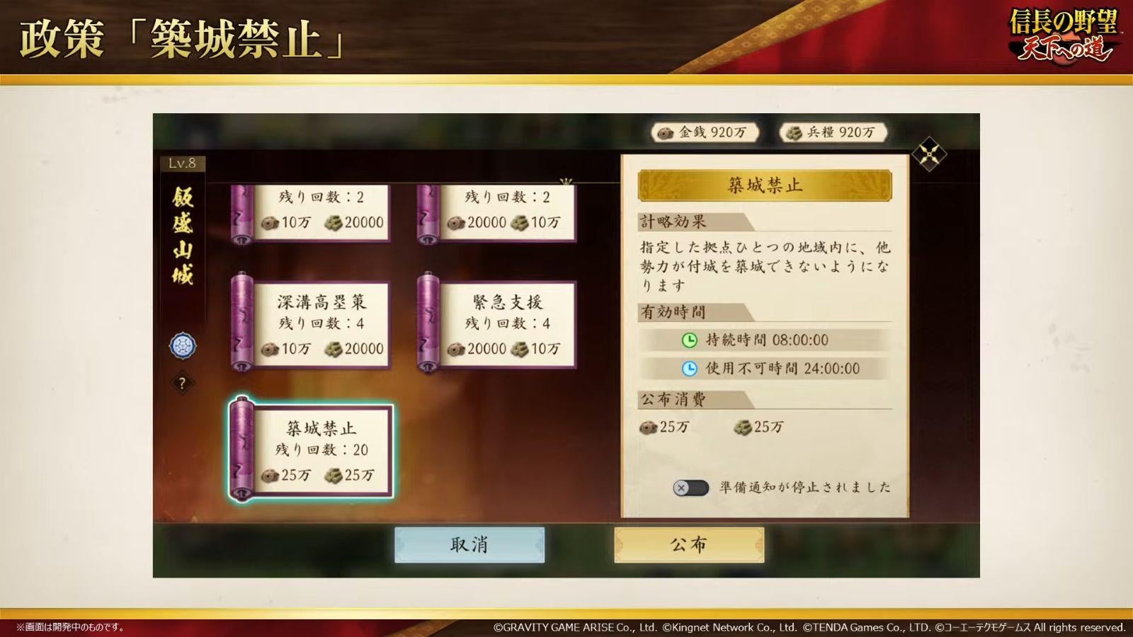 政策関連では、「道路敷設政策」と「築城禁止政策」にも注目だ。「道路敷設政策」は特定の関所同士をつなぐ道を建設できる政策で、これまででは実現不可能だったルートで攻めを展開することが可能となる。一方の「築城禁止政策」は、文字通り自拠点地域内の他勢力の付城建設を禁止する政策なので、防御を固めたいときに有効だ。どちらも拠点をめぐる攻防に関する政策なので、シーズン3では今まで見たこともないような新たな攻城戦のセオリーが生み出されるかもしれない。