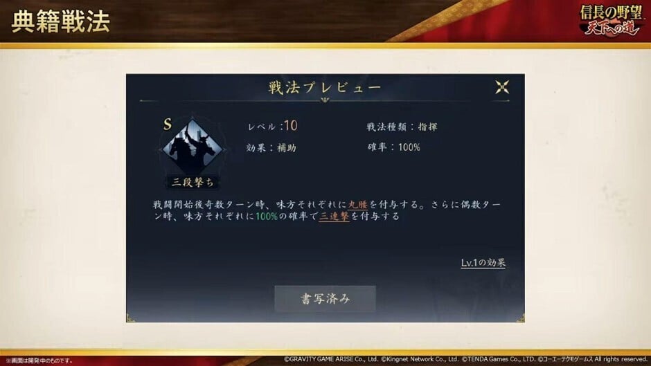 「典籍戦法」という新たな戦法システムも追加されている。これらの新戦法は特定の武将をイメージして設計されており、その武将を含めたSSR武将を複数消費することで獲得が可能だ。たとえば織田信長をイメージした「三段撃ち」は、「1ターン攻撃不能→次のターンに3連続攻撃」という動きを繰り返す戦法だ。攻撃不能となるターンこそ生まれてしまうものの総合的な手数は増えるため、攻撃ごとに発動する追撃系の戦法と組み合わせれば大きな有利を生み出すことができそうだ。