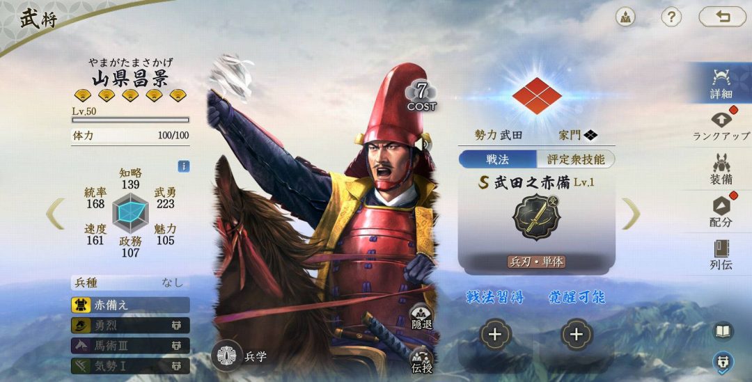 山県昌景は同じくコスト7の武田家の武将。武勇・速度ともに高く、特性の「赤備え」は通常攻撃の対象の、いわゆる防御力にあたる“統率”を軽減するデバフ。さらに固有戦法の「武田之赤備」は会心を獲得しつつさらに敵の統率を削れる、強力な攻撃スキルだ。武田家のエースとしての活躍が見込める、非常に優秀な兵刃アタッカーとなっている。編制としてはやはり武田信玄を大将にし、同じく「赤備え」をもつ飯富虎昌を加えると面白いだろう。敵の統率をぐんぐん削りながら、爆発的な火力を叩き出せるはずだ。また伝授戦法「縦横馳突」は自身に連撃を付与しつつ、封撃耐性を獲得する強力なもの。ほとんどの突撃武将にとって理想的なものになっているため、戦法伝授のために獲得するのもよいだろう。