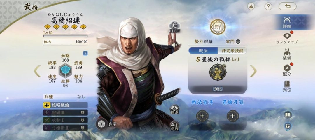 高橋紹運はコスト6の群雄勢力の武将。全能力がバランスよく高く、固有戦法「豊後の戦神」は自身に状態異常を受け付けない“洞察状態”を与える。また特性「雄略絶倫」は通常攻撃を受けたときに、敵の能力値を減退させる効果。高橋紹運は能力値のバランスがよいため、編制次第で計略アタッカーにも兵刃アタッカーにも、サポーターにもなれる素質がある。洞察のおかげで状態異常も怖くないため、とにかく安定した活躍が見込めるのが長所だ。部隊の穴を埋める使い勝手のよい武将になるだろう。どこにでも入れられる武将だが、たとえば一足先に実装されている立花道雪と組ませて活躍させると楽しいかもしれない。二人でコスト13とヘビー級だが、強さは折り紙付きだ。