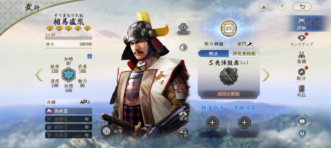相馬盛胤はコスト5の群雄勢力の武将だ。固有戦法「先陣鼓舞」は敵単体に兵刃ダメージを与えつつ、自軍単体の固有戦法の発動確率を増加させる。固有戦法が確率発動の能動スキルになっている武将と組ませれば、部隊全体の安定感が増すだろう。たとえば確率で味方を守る“鉄壁”を付与する北条氏康と編制すると、氏康単独よりさらに堅固な部隊が築けるはずだ。また相馬盛胤は武勇が高めなので、兵刃火力役もこなせる優秀なサポート武将だ。コストも5と控えめなので、編制の幅は広い。