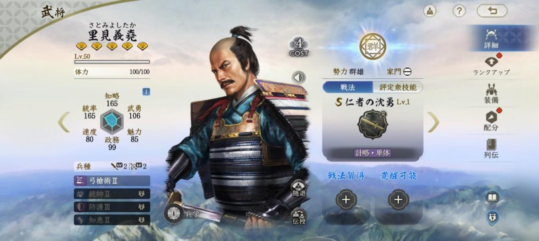 里見義堯はコスト4、群雄勢力の武将。固有戦法の「仁者懐勇」は通常攻撃後に確率で計略ダメージを追加で与える効果だ。コストが4と低いわりに知略と統率が高いため、特に総コストが低い序盤に活躍させやすい武将となっている。たとえばコスト3のお市と一緒に編制すれば、わずか7コストで武将二人分が埋まる。残った一枠に好きなエース武将を入れて、序盤から暴れ回ることが可能だ。コストの帳尻を合わせる上で、使い勝手がいい武将となっている。