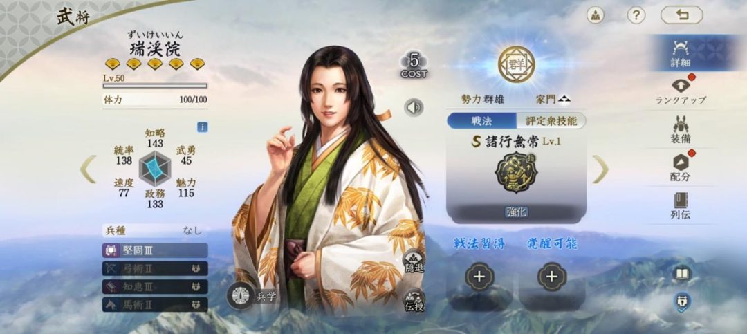 瑞渓院はコスト5の、群雄勢力の女性武将である。今川義元の姉で、北条氏康の正室として嫡子氏政らを産んだことで知られる瑞渓院。そんな彼女の固有戦法「諸行無常」は、最初の3ターン自軍が与えるダメージを上昇させるというもの。バフは強力だが、4ターン目からは逆にダメージを低下させるため、短期決戦に向いたサポーターだ。なお史実の夫である北条氏康は、本作では味方を守る持久戦向きの性能。瑞渓院を使うときはアタッカーを並べて、やられる前にやるのがよさそうだ。コストは比較的低いため、シーズン序盤からいろんな武将と合わせやすいだろう。