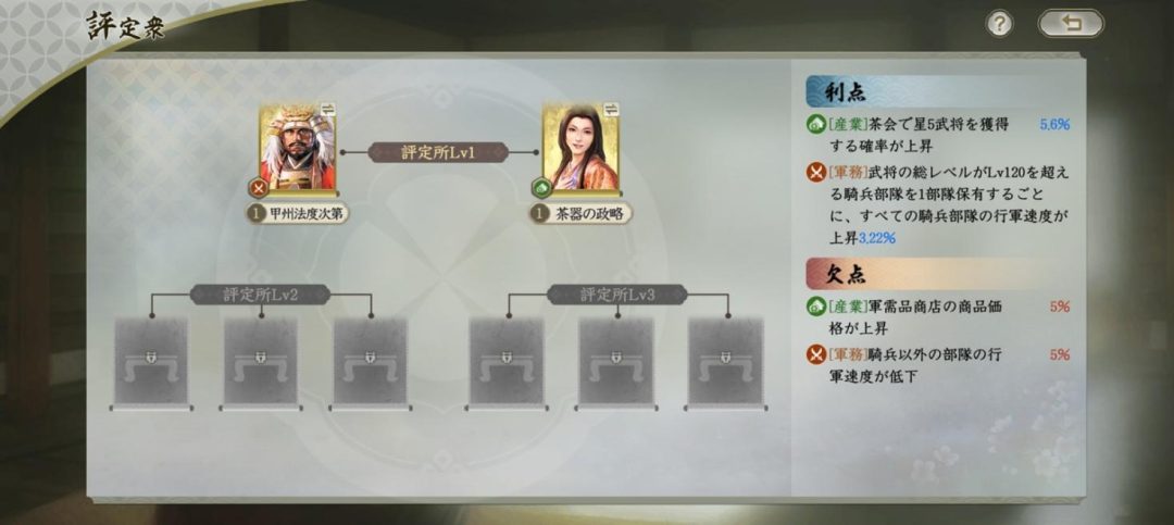 また変わったところでは、松永久秀とねねは「茶器の政略」という技能をもっている。これは茶会で星5武将が手に入る獲得確率を上げる効果。武将不足に悩むプレイヤーの心強い味方だが、起用すると軍需品商店の商品価格が上昇してしまう。