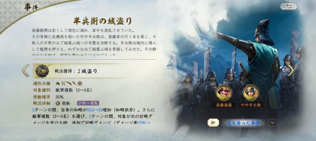 そして事件はただ鑑賞するだけでなく、特定の武将を専用戦法と交換することができるシステムと結びついている。たとえば「半兵衛の城盗り」イベントでは、手持ちの竹中半兵衛および斎藤家の星5武将をコストとして、「城盗り」というSランクスキルを獲得することができる。城盗りは自身の知略を上昇させつつ、複数の敵に計略ダメージを与える強力な攻撃スキルだ。知将系の武将に習得させれば大活躍するだろう。