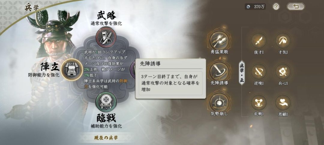 またS2シーズンでは新たに、いわゆるパッシブスキルにあたる「兵学」というシステムが実装される。兵学は武略・機略・陣立・臨戦の4種類に分かれており、武将ごとに1つの道を選んでスキルを覚えさせることができる。たとえば武略の中にある「知勇兼備」は、自分の武勇の値に応じて知略を増加させる兵学スキル。蜂須賀小六のように、武勇と知略がどちらも高いタイプの武将に向いている。