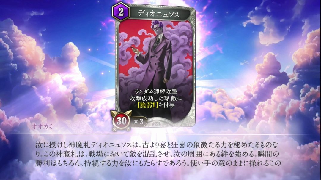 各種イベントにおける主人公の選択は、プレイヤーの傾向となってデータが蓄積される。そうしたデータをもとに主人公たちエージェントに大きな力を授けてくれる謎の神「オオカミ」の力によって、特別なカードを入手可能だ。オオカミが与えてくれるカードは強力なものが多いものの、発動コストが高い場合もあるので使い所が極めて重要なものとなっている。