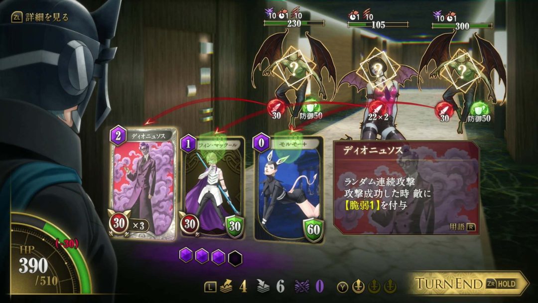 ただし、相手がボスキャラクターともなるとさまざまな攻撃を仕掛けてくるので注意が必要だ。相手がこちらに3方向の攻撃を仕掛けてくるときは、こちらも防御3枚で守りを固めたいし、相手の守備を打ち破れそうなときには積極的に仕掛けていきたいところ。試遊版をプレイしただけなので断言することはできないが、初見殺しのような理不尽な難易度にはなっていないように感じた。むしろ体力の多いボス戦で、ダンテと飯綱の攻撃の組み合わせの有用さに気づくことができたので、ボス戦で初めて見えてくるカードの組み合わせ方もあるのかもしれない。