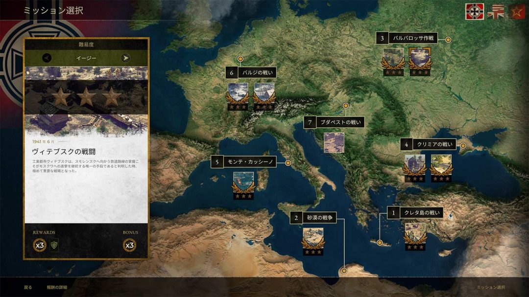また本作では連合軍、枢軸国、ソ連の3勢力によるキャンペーンが用意されており、合計25ミッションを収録。バルバロッサ作戦や北アフリカ戦線など史実の戦いを背景に、プレイヤーの選択によって戦況や進行ルートが変化するダイナミックキャンペーン形式が採用されている。星評価やチャレンジ要素も用意されており、同じミッションでも異なる攻略方法で繰り返しプレイできる設計となっているという。