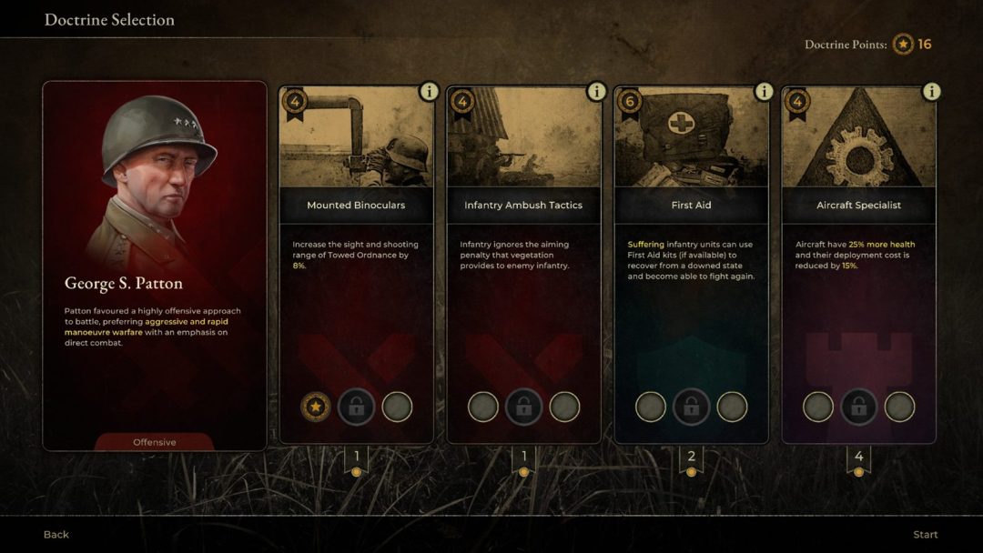戦術面では、司令官とドクトリンカードによるカスタマイズ要素も大きなポイントとなる。本作では連合軍、枢軸国、ソ連の各陣営にそれぞれ3人の司令官が用意される。司令官は攻撃型、防御型、戦術型の3タイプに分類され、パットンやグデーリアン、ロコソフスキーなどが登場。各司令官が固有スキルや能力を持ち、プレイスタイルに大きく影響するという。